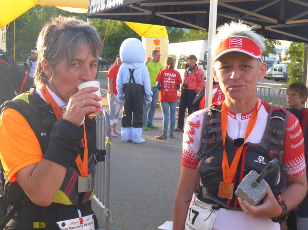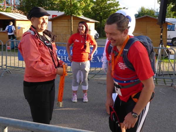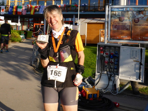 Wir erhalten unsere Medaillen. Dann nimmt mich Norbert in Empfang. Er hat die 10 Stunden-Marke geknackt - Klasse. Stolz hole ich mein heiß ersehntes Steinmännchen ab. Für den Besuch des Wonnemars ist es mir zu spät. Norbert hat seinen Saunagang und die Massage schon hinter sich und so stärken wir uns nur noch an den Resten der Zielverpflegung.