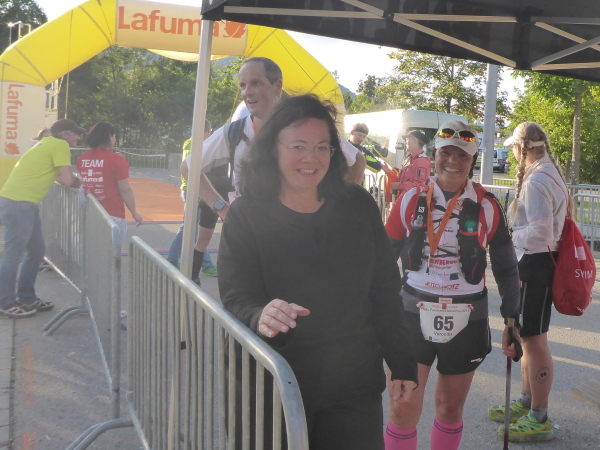 Zwei Läufer vor mir gehen nur noch und lassen mich gerne vorbei. Da kommt das km 68 Schild. Als ich die ersten Häuser von Sonthofen erreiche, höre ich Schritte von hinten. Didi mit Guide Jürgen fliegen an mir vorbei. Sie haben Sorge, das Limit zu verpassen und legen einen Endspurt hin.