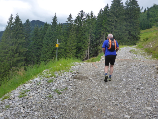 Hinter der nächsten Kurve erreiche ich dann die Cut-Off Stelle. Ein freundlicher Helfer notiert meine Startnummer und bietet mir Schokolade an. Es gibt noch Wasser und Cola. Dann zeigt er mir, wo ich hin muss. Erst mal geradeaus, dann am Schild scharf rechts den Berg hinauf. Erst durch den Wald und dann tendenziell rechts. Der Gipfel ist von hier aus nicht zu sehen. Er wünscht mir noch einen schönen Weg zum Ziel; dann bin ich entlassen.