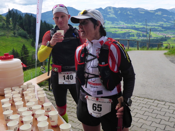 Neben der Pflichtausrüstung hatte ich eine kleine 125 ml Flasche dabei, die ich mir an den Getränkestellen oder unterwegs an Brunnen immer wieder mit Wasser aufgefüllt habe. Das war bei den moderaten Temperaturen und dem Regen ausreichend. Zwei Früchteriegel und ein Gel halfen mir die langen Entfernungen zwischen den Vollverpflegungsstationen zu überbrücken. Denn mit meinem langsamen Lauftempo kommen da jedes Mal einige Stunden zusammen.
