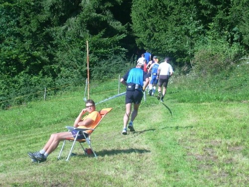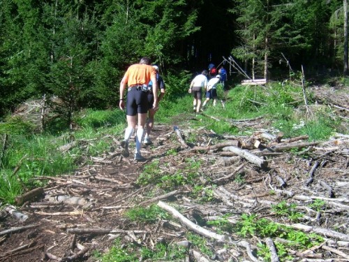Es geht in den Wald, steil bergan. Alles marschiert. Zum Teil ist es etwas schmierig. Ich komme mit Jürgen Titze vom Team Köln ins Reden. Die sind alle von der Bundeswehr und haben sozusagen ein Wochenende bei Y-Reisen gebucht. Später wird der Weg ruppig, da lauter kurze Holzprügel umherliegen. Es folgt abermals ein kurzer Wiesentrail, bevor wieder auf Asphalt gelaufen wird.