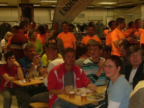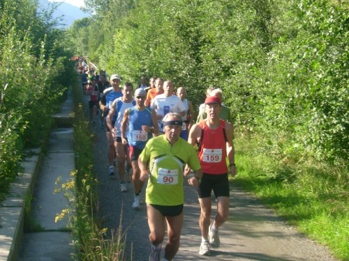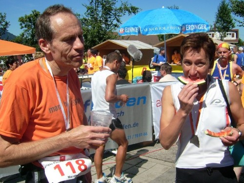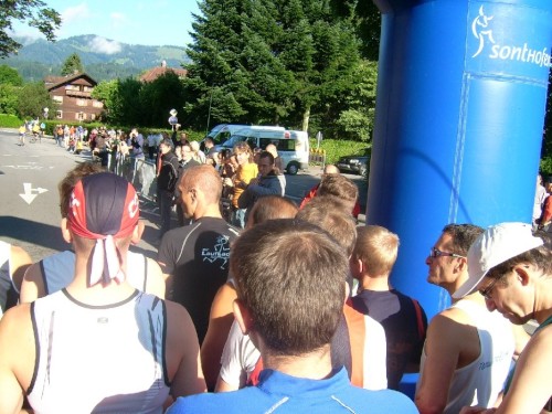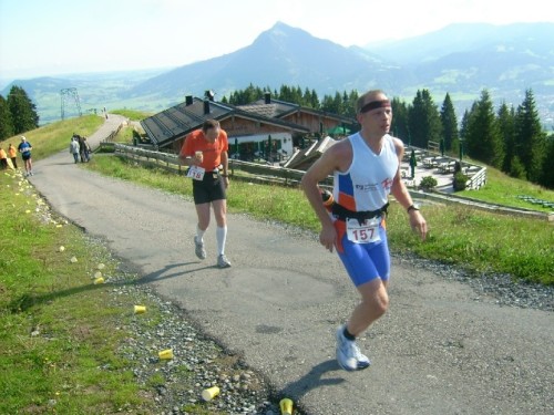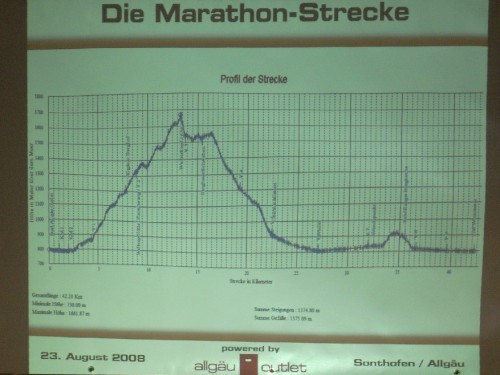 Es ist bedeckt und regnet leicht bei empfindlich kühlen Temperaturen. Wer Zeit und Interesse hat, kann noch im Allgäu Outlet günstige Sportkleidung kaufen. Im ersten Stock werden schon Nudeln verputzt. Wem ein Teller Nudeln nicht reicht, der darf gerne noch Nachschlag holen. Ein Erdinger zum Hinunterspülen kommt nicht nur mir grade recht. Zum Ende der Nudelparty gibt es dann noch die Wettkampfbesprechung, so wie es in der Triathlon-Szene üblich ist. Die Läufer nehmen die Informationen gerne mit, insbesondere werden wir davor gewarnt, dass man von der Hörnergruppe zu schnell hinunterdonnert. Der 2007 bis dahin Zweite ist regelrecht an der Iller bei Kilometer 28 aufgeschlagen und wurde dann noch auf Rang acht hintergereicht.