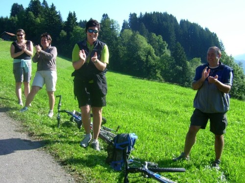 Wir verlassen den befestigten Weg, ein abgemähter Wiesentrail folgt. An der Seite steht ein Feuerwehrauto, der Fahrer hat sich einen Campingstuhl mitgebracht und beobachtet. „Des kostet fünf EURO“, sage ich zu ihm. Er schaut fragend. „Na, wegen der schönen Aussicht!“ Wir gewinnen jetzt schon viele Höhenmeter, die Aussicht auf Sonthofen, Immenstadt und in Richtung Oberstdorf ist herrlich. Am gegenüberliegenden Grünten lässt sich unsere Höhe gut einschätzen.