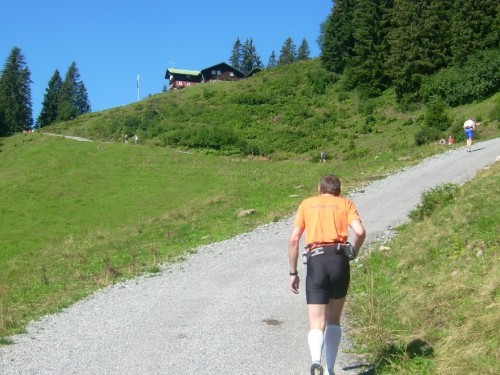 Jetzt können wir bis zum Berghaus Schwaben (Kilometer 15) brettern. Eine geteerte Rennpiste, da freut sich der Laufschuh. Die Spaziergänger schauen leicht verwirrt. Unterhalb des Berghauses ist der ganze Schwung wieder dahin, es geht nochmals bergan.