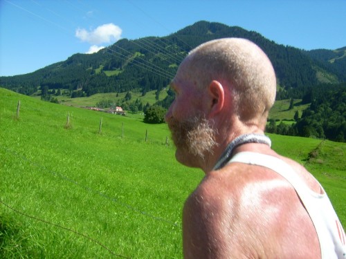 Martin Feigel ist jetzt 50 Meter vor mir an einer Steigung. Eine Kuh zeigt ihm sein Hinterteil. Ich muss lachen. Später geht es steil bergauf zum Weiherkopf. Zwei Frauen sitzen oberhalb vom Weg. „Ja, Herrschaftszeiten, der hat no Zeit zum Fotografiera“, höre ich. „Aufpassen, nicht fluchen, da Himmivater kennt des hörn und dann gibt’s a Donnerwetter“, erwidere ich.