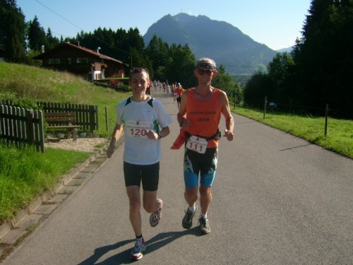 Nachdem ich im Verein den Lauf vorgestellt habe, schließt sich Petra Mayr zur Reise ins Allgäu an. Sie will zwar nicht den langen Kanten, doch den „Halben“ absolvieren und fragt mich mehrmals nach dem Streckenprofil. Da ich ihr wohl als bergerfahren gelte, nimmt sie mir den „Huckel“ auf der Halbmarathonstrecke noch ab, bis sie doch dann die Wahrheit der über 200 Höhenmeter im Internet erfährt. Ich kann grad noch eine Ausrede erfinden.