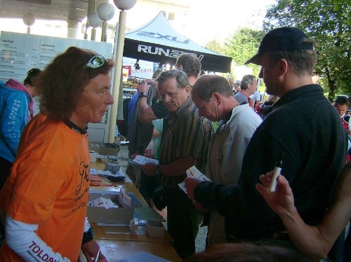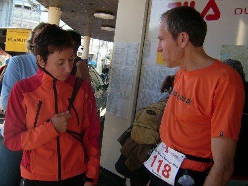 Am Allgäu-Outlet ist schon reges Treiben festzustellen. So sehe ich den Klaus Neumann, letzte Woche war er noch zum IVV-Doppeldeckermarathon in Crailsheim, den Commissario Manne Luginger sowie m4y-Reporter Daniel Steiner. Martin Feigel und Martin Wildmoser sind auch da, beide aus meiner Heimat. Sie waren wohl zu Hause recht grantig, so dass man sie wieder zum Marathon geschickt hat. Und noch einer fällt mir aus meinem Verein auf, der Roland Rigotti, der wohl auf dem Halben mitmischen will. Und dann sind da die neonorange-farbenen Shirts der Kölner, die mit rund 50 Sportlern den Weg vom Rhein an die Iller gefunden haben.