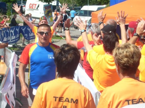 Petra kommt entgegen, sie läuft aus und feuert mich nochmals an. Die Strecke verlässt den Damm, noch ein knapper Kilometer. Einem Helfer rufe ich zu: „Jetzt wird’s Zeit fürs Bier.“ Der lacht natürlich.