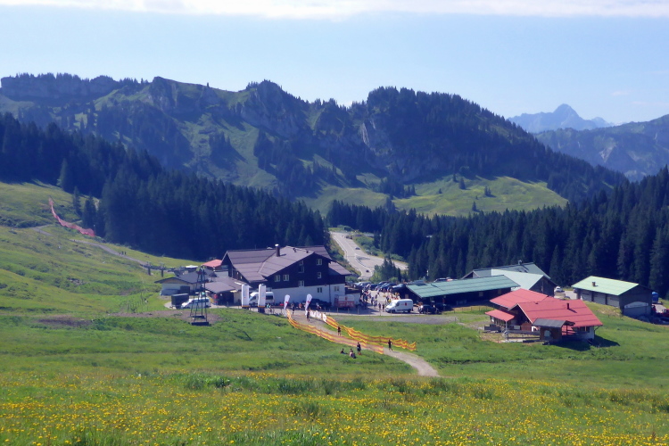 Meine Kamera verschwindet erst mal in der Hosentasche, denn auf der ziemlich steilen Bergab-Passage sind Konzentration und Trittsicherheit gefragt. Alles geht gut. Der weitere Weg ist wellig und in der Ferne kann ich schon das Berghaus Schwaben sehen, die nächste Verpflegungsstation. Auf dem schmalen Teerweg kann man es bergab gut laufen lassen, nur ab und zu bremsen einen Anstiege wieder etwas ein. Die letzten paar hundert Meter hoch zum Berghaus Schwaben haben es noch einmal in sich. Es sind 14,7 Kilometer geschafft und ich belohne mich erneut mit einem Becher Iso.