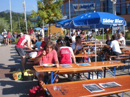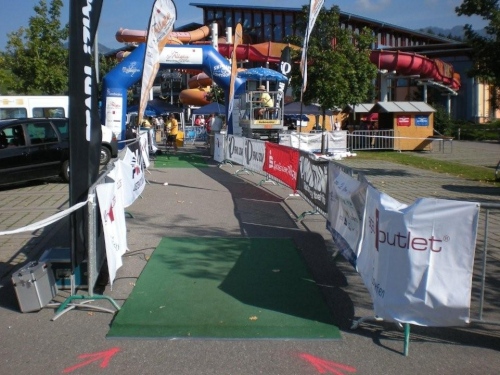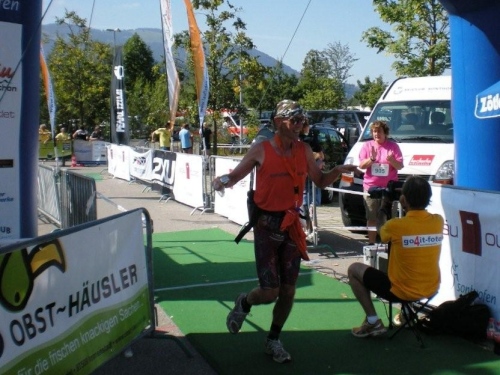 Es gelingt mir, mit einigem Abstand zwar, den beiden auf den Fersen zu bleiben und stelle beim Verlassen des Waldes erstaunt fest, dass das Wonnemar nur noch etwa dreihundert Meter entfernt ist, mit der kleinen Schlaufe unwesentlich mehr bis zum Zieleinlauf. Nach einem Blick auf die Uhr sind alle noch verfügbaren Kräfte mobilisiert und ich setze zu einer filmreifen Flucht an. Etwa hundert Meter vor dem Zielgelände hole ich einen der beiden Überholer ein und hoffe nur, dass sich jetzt nicht noch die Bahnschranke senkt. Die Hoffnung erfüllt sich und ich mache mir keine Mühe mehr, meinen eigenen Zieleinlauf zu fotografieren. Der Ehrgeiz hat mich zu fest gepackt. Bernie erwartet mich im Ziel, muss sich aber einen Moment gedulden, bis ich wieder sprechen kann. Mission accomplished! Die offizielle Mission, erster Teil, habe ich erfolgreich zu Ende gebracht, den zweiten Teil des Auftrags habe ich erfüllt, wenn dieser Bericht online ist. Aber auch meine geheime Mission habe ich erfolgreich beendet. Die zweieinhalb Minuten, die ich in Davos irgendwo verschenkte, sind im Ziel noch bei mir. Ich habe den Ultra Trail tatsächlich, wenn auch nur knapp, unter neun Stunden geschafft.