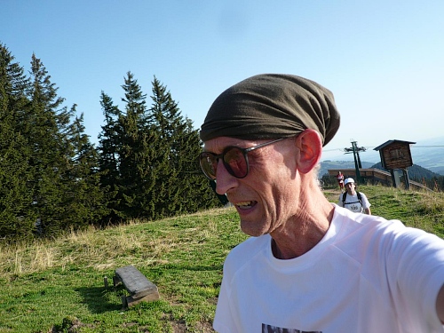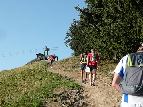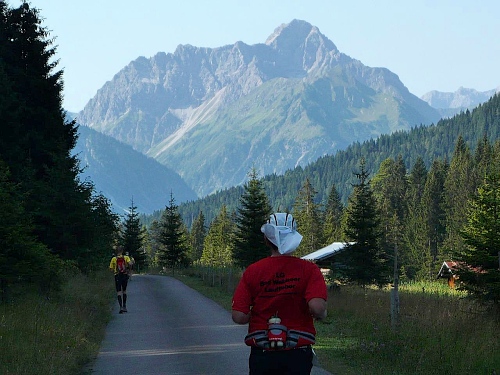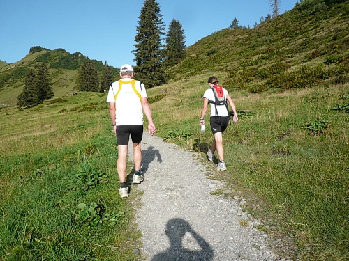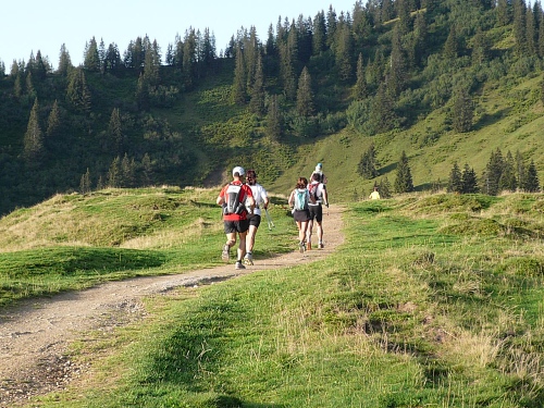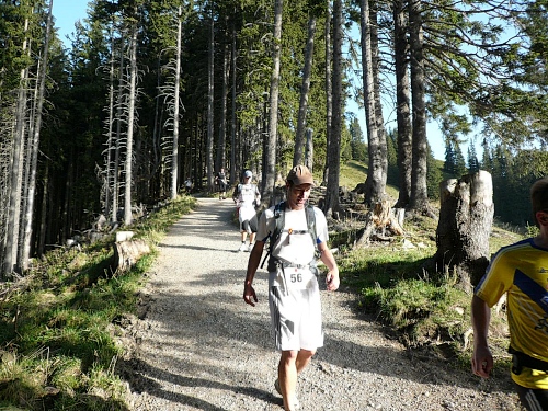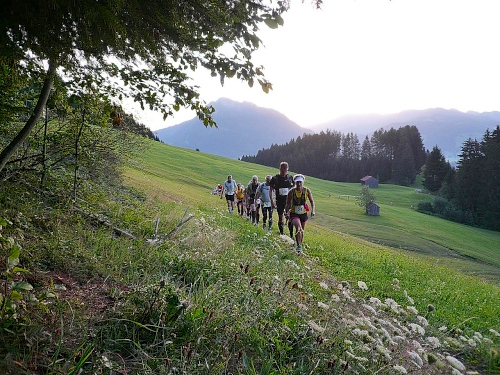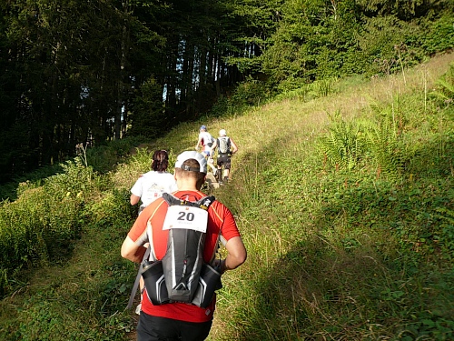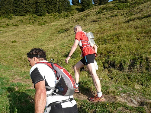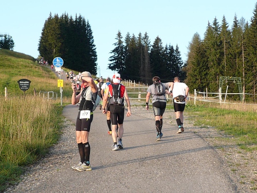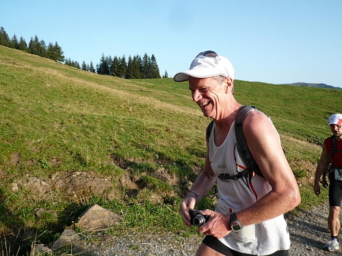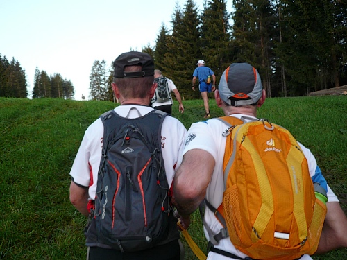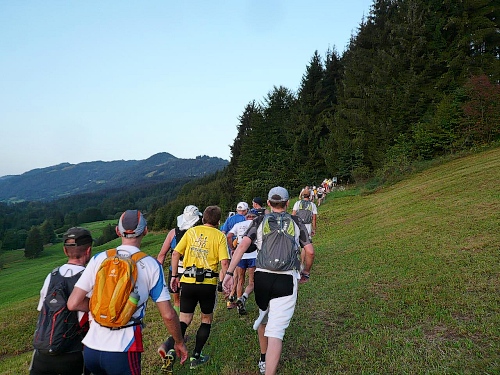 Immer weiter geht es aufwärts, manchmal auf Graswegen. Obwohl die Sonne noch nicht aufgegangen ist, merkt man, es ist auf der Höhe wärmer als im Tal. Und das Gras hat kaum oder keinen Tau. Dann folgt ein kurzer Stich in einem Waldstück, auch auf Wurzeln müssen wir aufpassen. Vor mir läuft Anton Luber, ihr kennt ihn und sein Handicap. Wolfgang Böss begleitet ihn. Richtig taktisch laufen beide über diesen Trampelpfad, der Wurzeln und Steine aufweist. Wolfgang vorne, weist den Anton ein. Und der läuft auf dem schmalen Pfad hinterher, mit einer Hand an Wolfgangs Rucksack, damit er die Richtung nicht verliert. Und beide sind nicht recht langsamer als das laufende Volk.