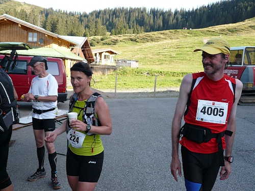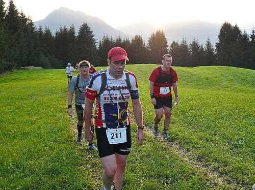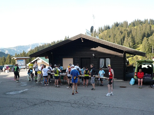 Wir verlassen den Wald und sehen nach wenigen Augenblicken ein paar Meter weiter die Sonne hinter den Bergen im Osten emporsteigen. Ein herrlicher Moment, einige bleiben kurz stehen und genießen die Szenerie. Später werden unsere Startnummern aufgeschrieben. So kann man recherchieren, wenn ein Läufer im Ziel abgeht. Ja, wer abbricht, sollte bei jedem Berglauf seine Aufgabe an einen Helfer oder Verantwortlichen melden. Nicht dass dann eine aufwendige Suchaktion gestartet werden muss. Es könnte teuer werden.