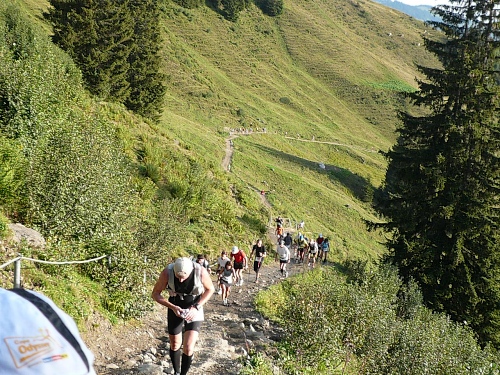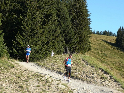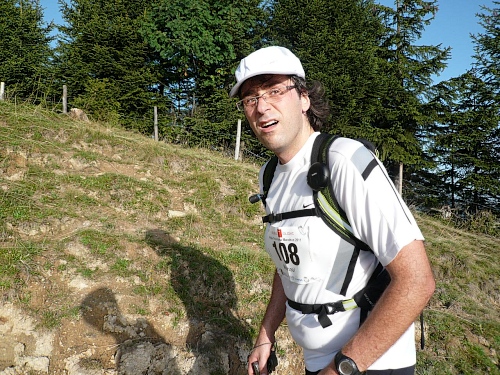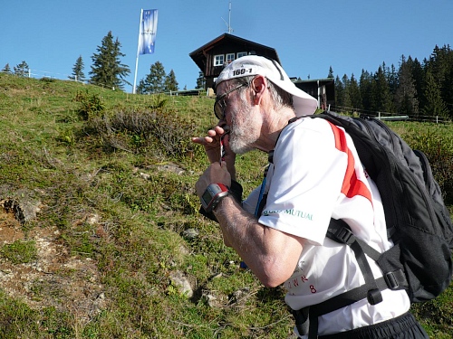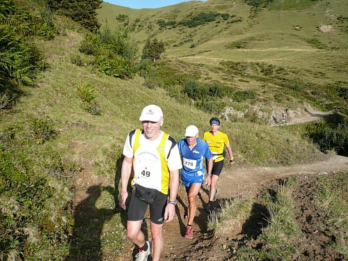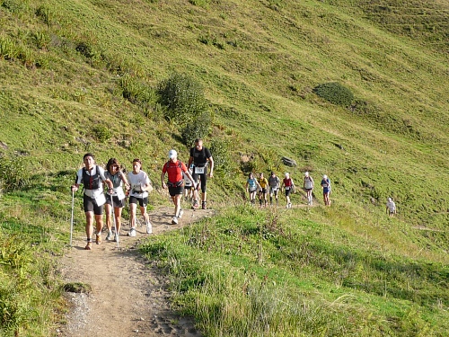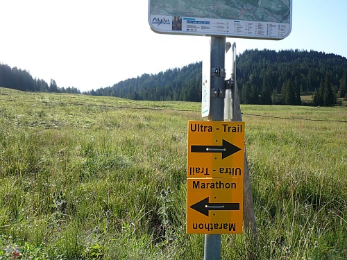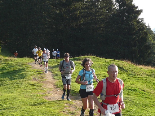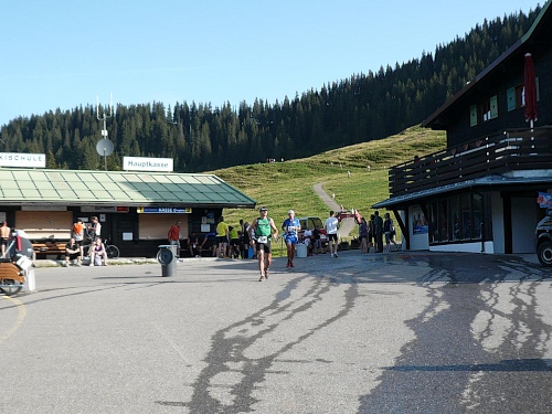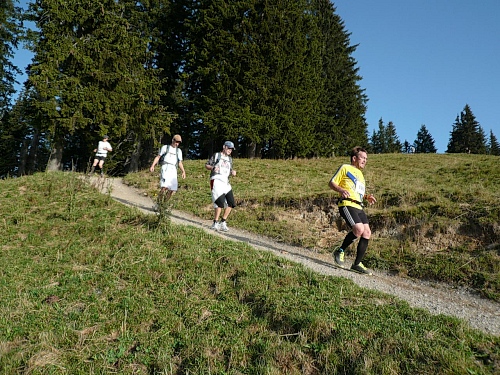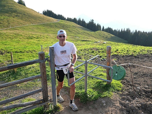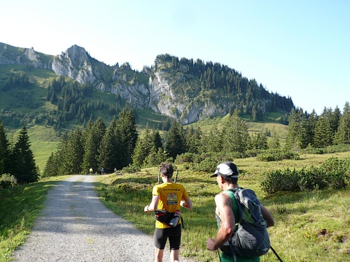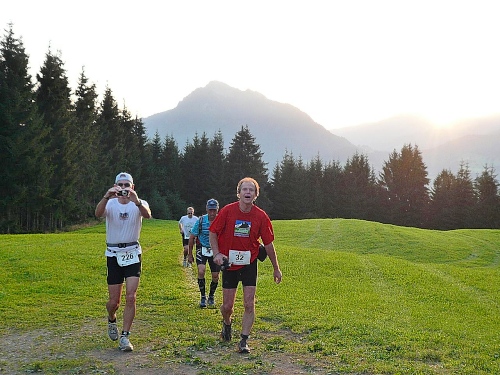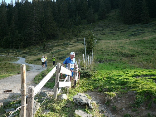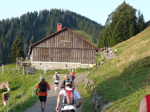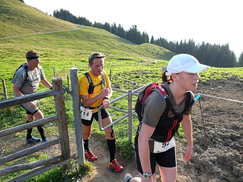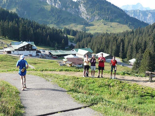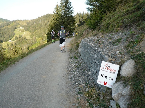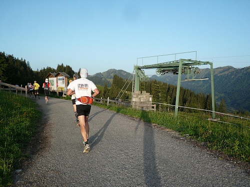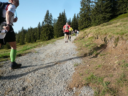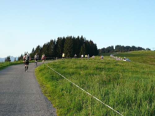 Es geht auf dem Grat östlich des Riedberger Horns. Unschwierig zu bewältigen, auch wenn wieder marschiert werden muss. Oben warten ein paar Zuschauer und feuern uns an. Auch ein Profifotograf wartet auf die Läufer. Wir wechseln auf das Gebiet einer anderen Alm. Das Wechselgatter, wo immer nur einer durch kann, ist blöd gebaut. Wer nicht aufpasst, der bleibt mit der Seite oder der Hüfte an dem Eisenteil hängen und kann sich so leicht prellen.