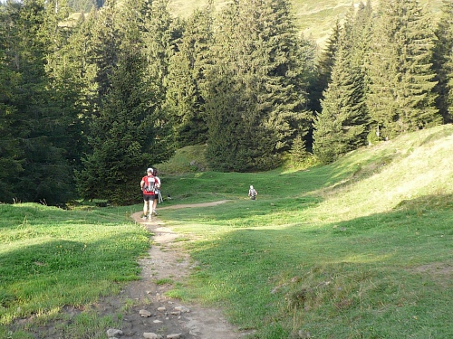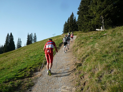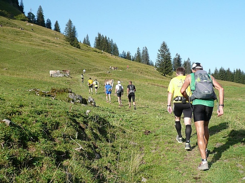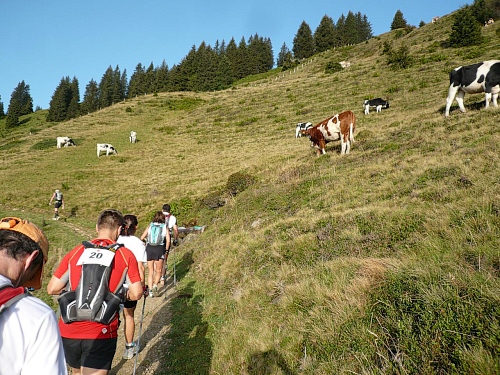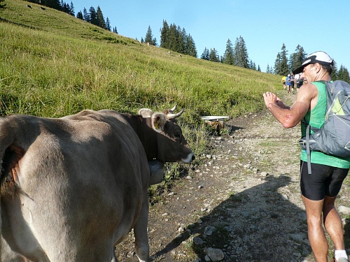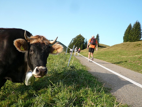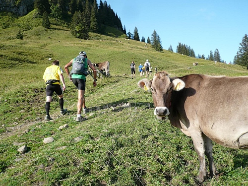 An einer Almweide laufen wir an Kühen vorbei. Auffällig sind die Glocken, die glänzend gewienert sind. Auf einen Pfiff schaut eine Kuh in meine Richtung. Schuss. Immer wieder werden Läufer geknipst. Jetzt sind alle noch fröhlich und gut drauf. Der gemeine Morgenmuffel wird noch in der Kiste liegen.