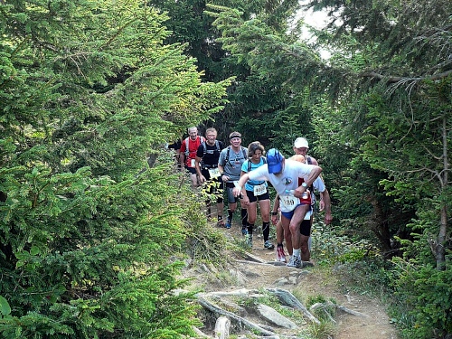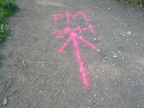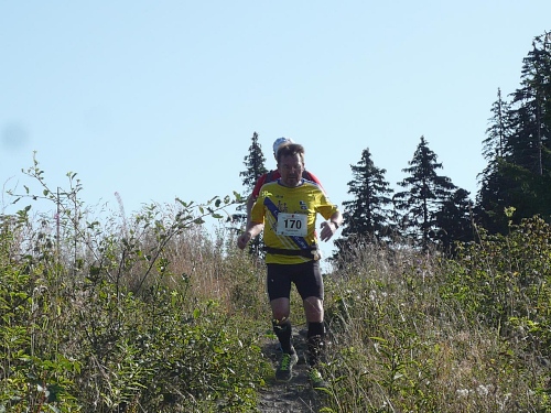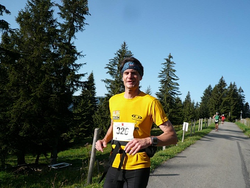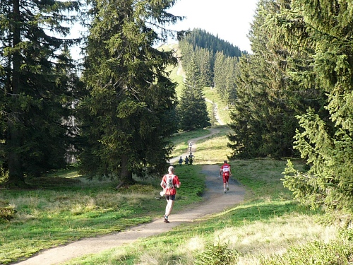 Nach der Trennung der Marathonis (die laufen links, wir rechts) gibt es die einzige größere Streckenverlegung. Das Rohrmoos, wo 2010 einige bis zu den Knien im Morast standen, muss aufgrund des bisherigen nassen Sommers umgangen werden. Axel fürchtet, dass einige bis zu den Hüften einsinken könnten. Ja, und wer Baaz und Dreck jetzt vermissen sollte, der kann ja nächstes Jahr beim BraveHeart in Münnerstadt schweinigeln.