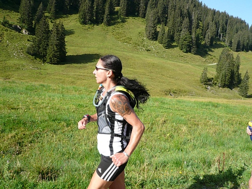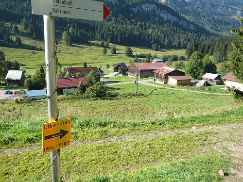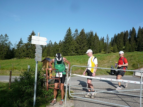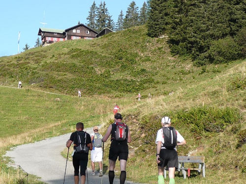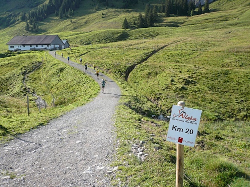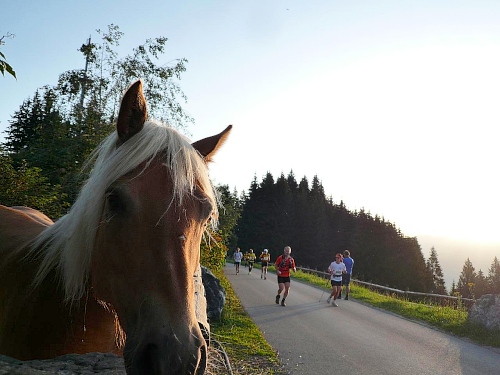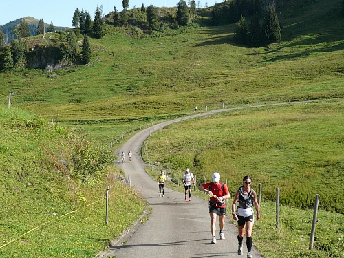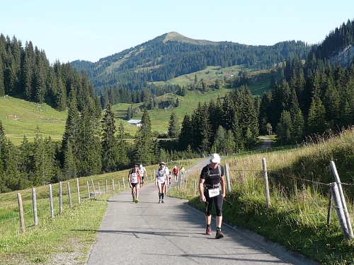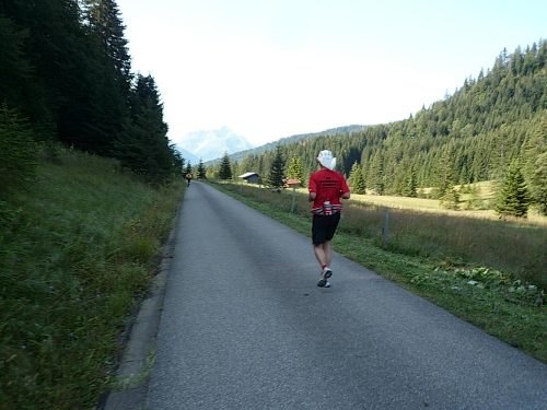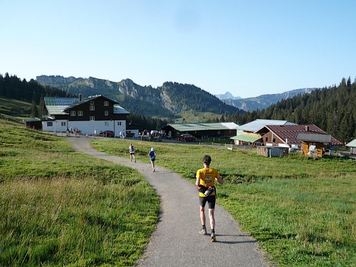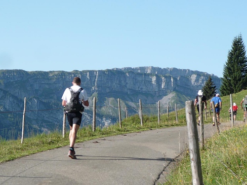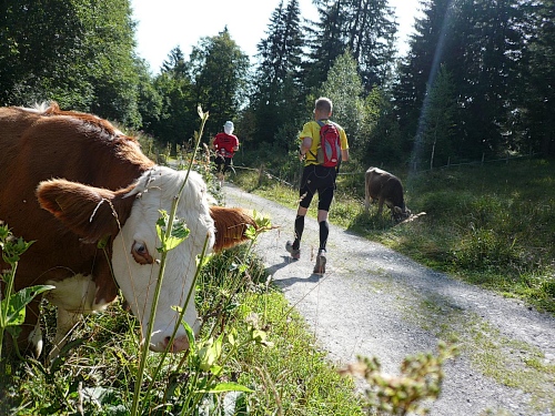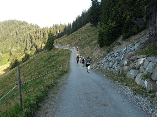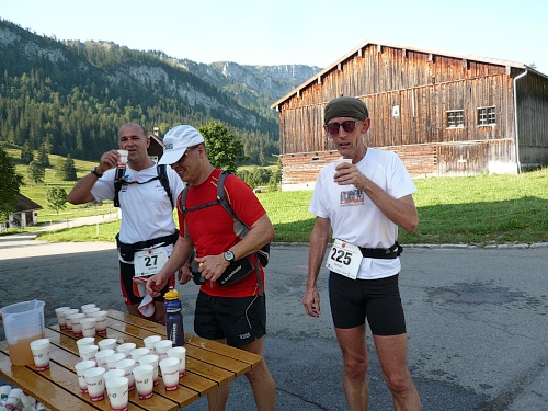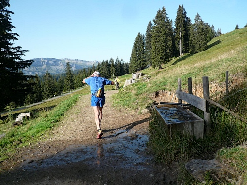 Der Asphalt endet, es geht aber leicht wellig und problemlos weiter. Im Bolgenstall wechselte früher die Laufrichtung der Marathonis ins Bolgental. An den Kuhtränken erfrischen sich nun die Läufer, denn die Sonne hat schon Kraft. Ich merke das an meiner schwarzen Laufhose, die sich mit Wärme auflädt.