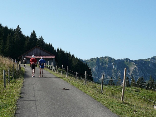 Wer jetzt mag, der kann es auf dem bequemen Asphaltweg zum Berghaus Schwaben schön rollen lassen, auch wenn vor der Berghütte noch ein Marschierstück wartet. 14 Kilometer liegen schon hinter uns, grad mal 20 Prozent der Wegstrecke.