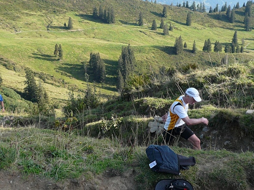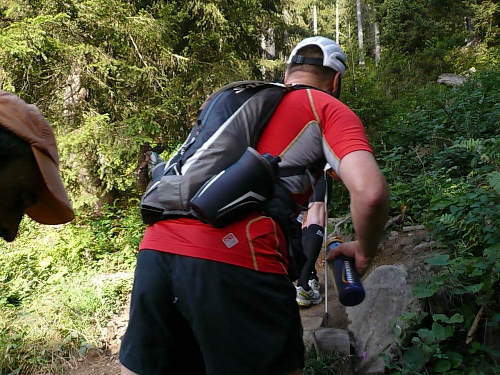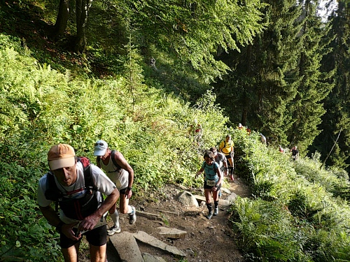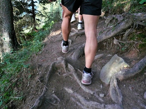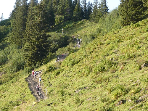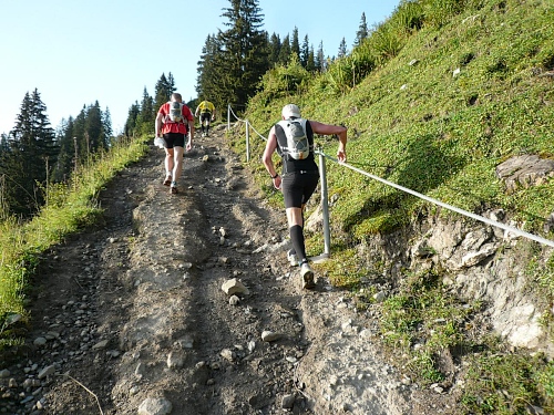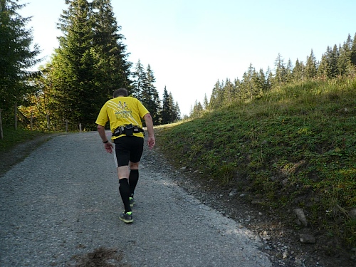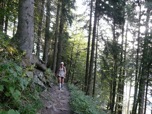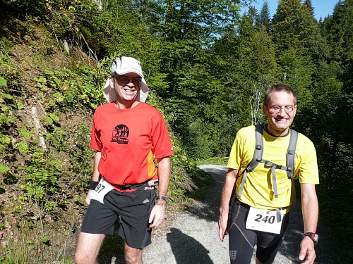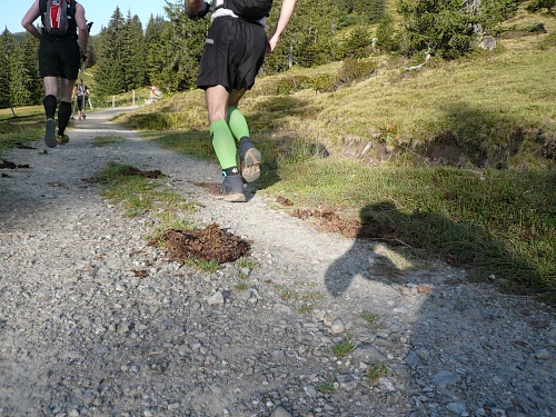 Es folgt ein ruppiger Teil über Wurzeln, Steinen und Stufen um das Sigiswanger Horn herum. Einen guten Kilometer müssen wir aufpassen, mitunter ist auch der Weg schmal. Hier lässt das Gespann Wolfgang und Anton eine Menge Läufer vorbei, denn aufgrund der Wegbeschaffenheit wird es für beide hier kurz schwierig.