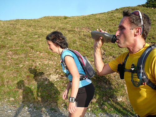 Auf Asphalt, mehr oder weniger steil, geht es zur Weltcuphütte. Dort sind rund 500 Höhenmeter schon Geschichte. Kurz vorher können wir unseren Durst und Hunger mit Wasser, Iso und Bananen stillen. Ich schütte mir zwei Becher hinter die Gurgel. Weiter.