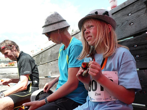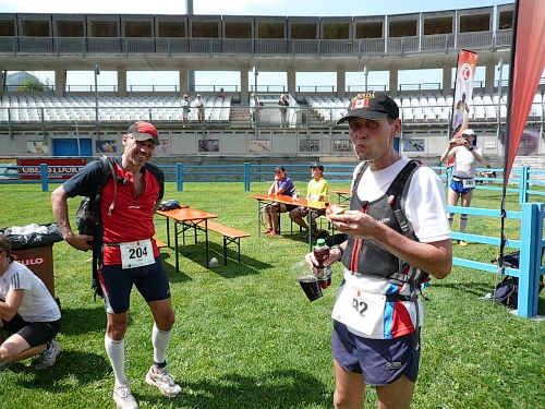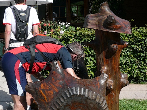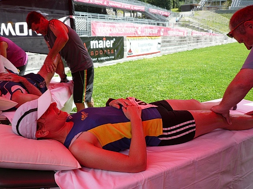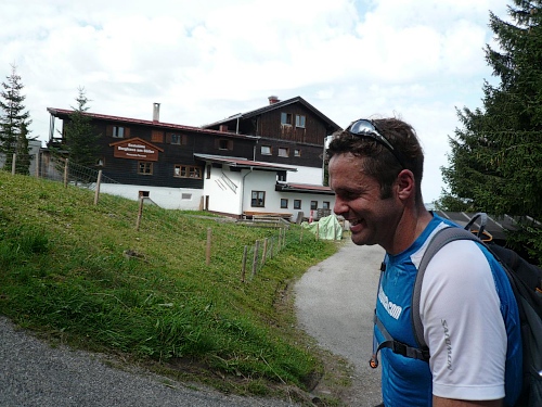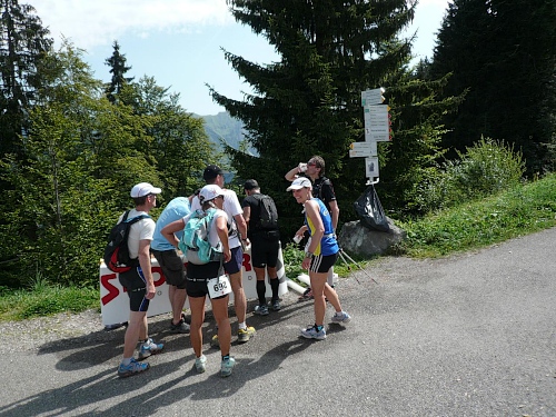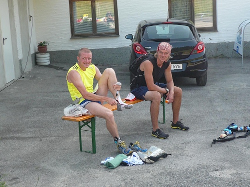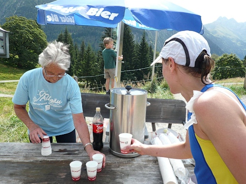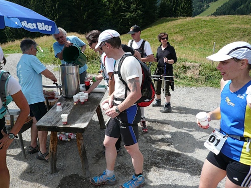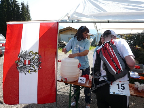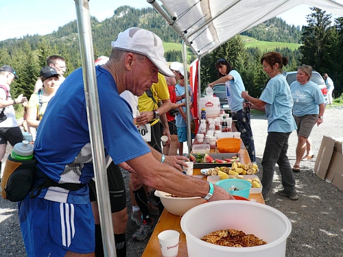 Am Gasthof Hörnlepass, irgendwo vorher haben wir die Grenze zu Österreich überschritten, gibt es wieder Vollverpflegung. Eine ganze Traube Trailer hängt vor der Essenstheke herum. Mario schmeißt sich eine Ladung Wasser ins Gesicht und das mache ich ihm nach. Die Wärme muss weg vom Körper. Am Essenstisch sehe ich Salzbrezeln, Melonen, Nüsse und Melonen. Nur kein Bier. Dafür wäre es mir noch zu früh. Übrigens, ein paar Minuten für eine gescheite Nahrungsaufnahme sollte man sich schon gönnen. Denn im Vorbeilaufen sich was greifen, das ist sicherlich zu wenig. Ein paar Meter in Laufrichtung liegen ein paar Rucksäcke mit der Wechselbekleidung und den Wechselschuhen. Ein Transport ist sichergestellt.