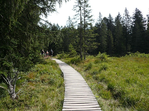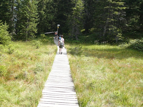 Als ich mich wieder auf den Weg mache, bin ich überrascht, da es nochmal ein längeres Wegstück hoch geht. Aber bei einem Hochmoor endet die Steigung. Ein Holzpfad führt da durch.