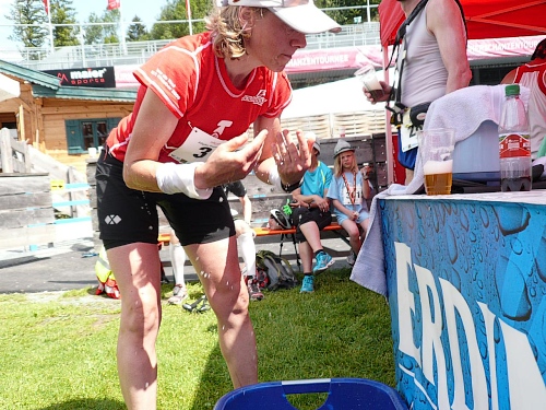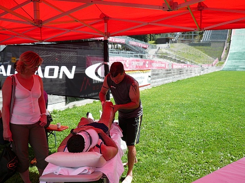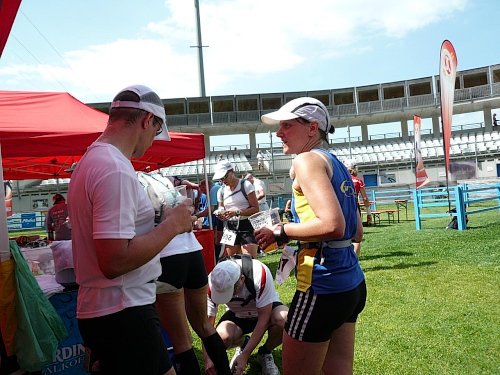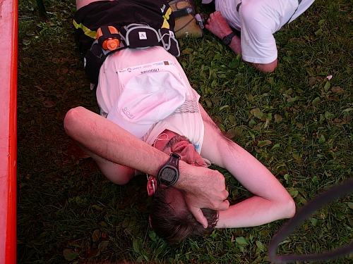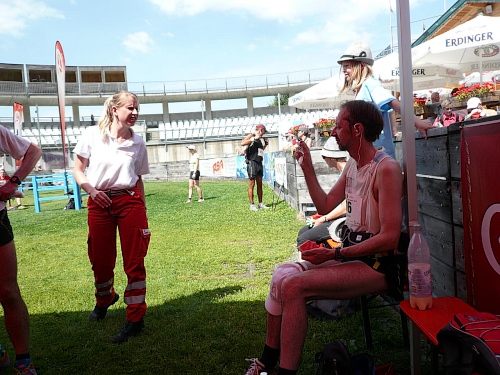 Noch ein Stückchen bergauf, dann werden wir um die Erdinger Arena geleitet. Dann laufe ich in die Sportstätte und werde von einem Moderator angekündigt. Mir ist mittlerweile übel. Kann außer einem kleinem Stückchen Kuchen nichts essen. Wenigstens bring ich mein geliebtes bayerisches isotonisches Getränk hinunter. Die Getränkeflasche fülle ich mit diesem Genussmittel auf. Wer eine Massage braucht, dafür ist gesorgt. Wer jetzt malade ausschaut, muss damit rechnen, von einem Sani angesprochen zu werden. Zum Abschluss meiner zehnminütigen Pause pumpe ich eine Halbe Colaweizen ab in der Hoffnung, dass meine Übelkeit verschwindet. Wer mit sich und dem Rennen fertig hat, der kann mit 49 gelaufenen Kilometer aussteigen, erhält Medaille und eine Zeitwertung. Wer hier nach dem Cut-Off um 14.15 Uhr erscheint, wird aus dem Rennen genommen.
