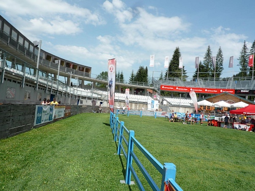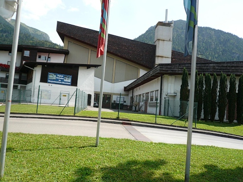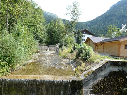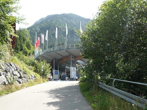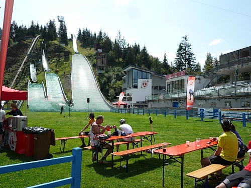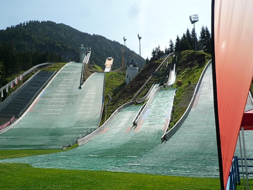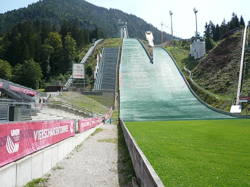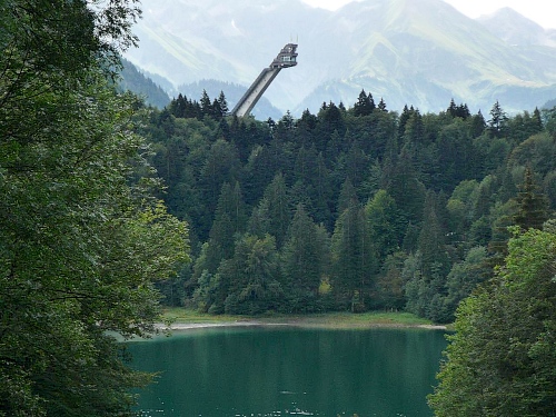 Jetzt laufen wir am Eissportzentrum sowie an der Talstation der Nebelhornbahn vorbei. Dann führt uns der Weg hoch zur Erdinger Arena, der Skisprunganlage in Oberstdorf, wo in den Tagen nach Weihnachten die Vierschanzentournee eröffnet wird. Im rechtsfließenden Bach machen zwei Bikiniteenies ein Fotoshooting.