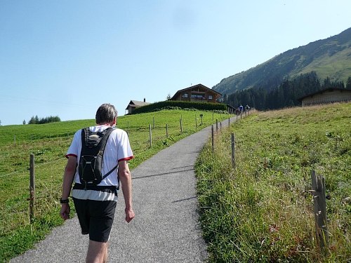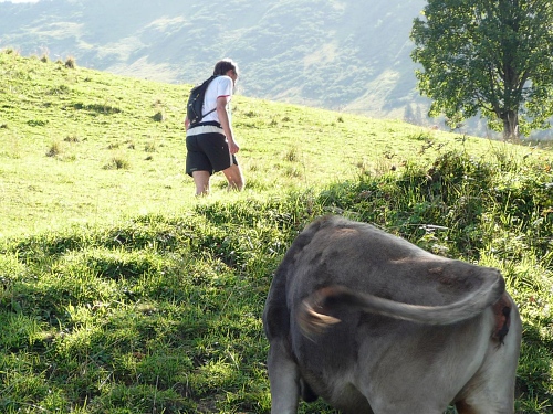 Die Steigungsprozente bleiben hoch, so gewinnen wir Höhenmeter und Höhenmeter. Wesentlich mehr Leute sind hier unterwegs. Aber da hat kaum einer Rucksack am Buckel noch Wanderschuhe an den Füßen. Entweder haben sich die Urlauber hier oben einquartiert oder sind mit der Söllereckbahn hochgekommen.