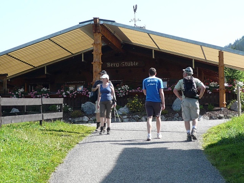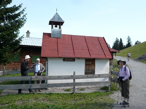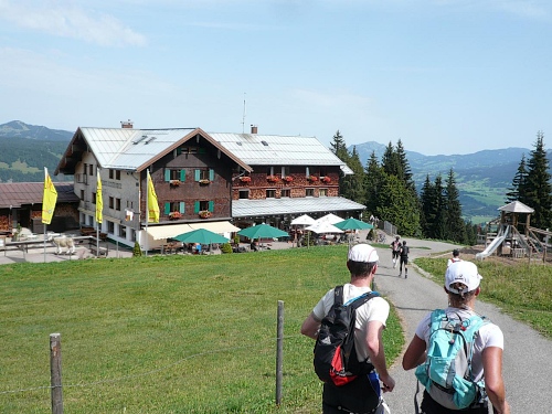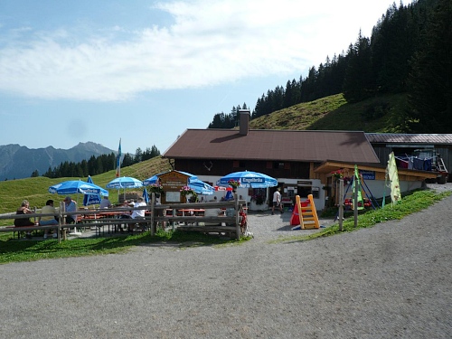 Ein längeres Stück laufen wir mit wenig Steigung entlang der Innerwesteggalpe, Amansalpe und Schrattenwangalpe, wo im Garten sich viele Touris bei Trank und Speis gut gehen lassen. Unerwartet taucht dann die Söllereckbergstation auf. Wieder eine Tankstelle. Die Aussicht ist spektakulär ins Illertal nach Norden, zum Gottesackermassiv nach Westen oder nach Süden zum Talschluss.
