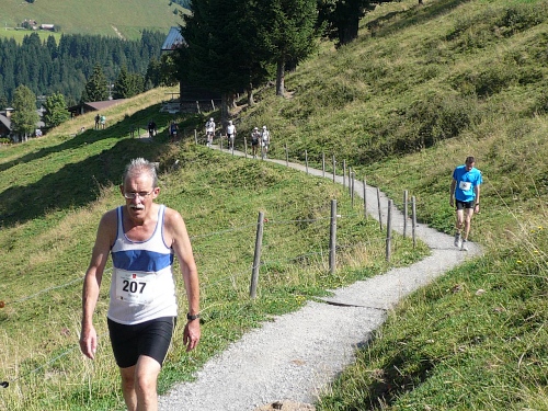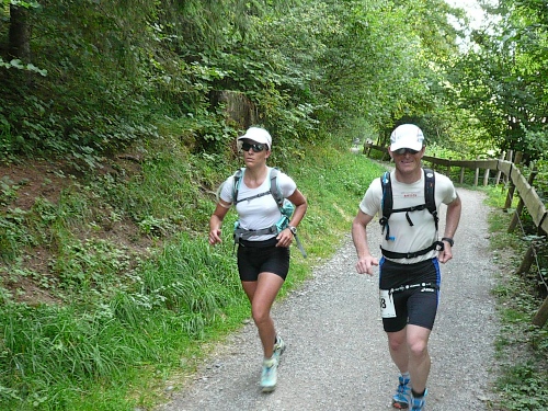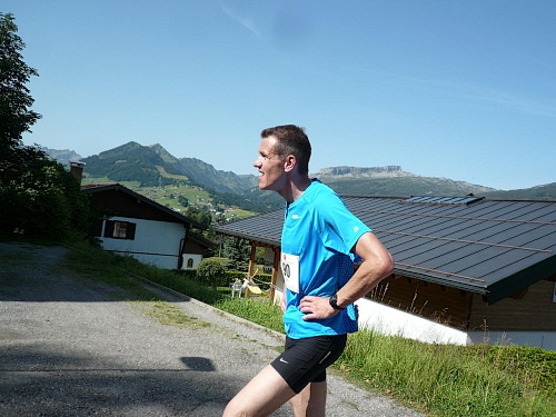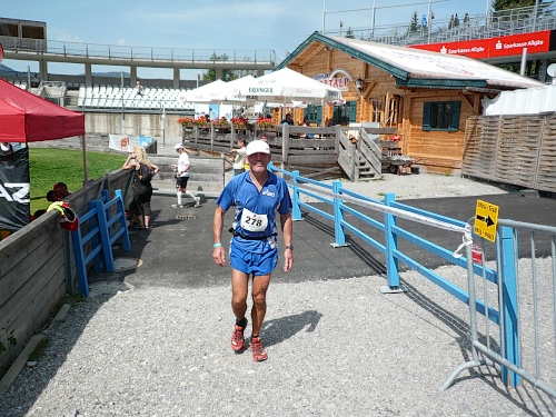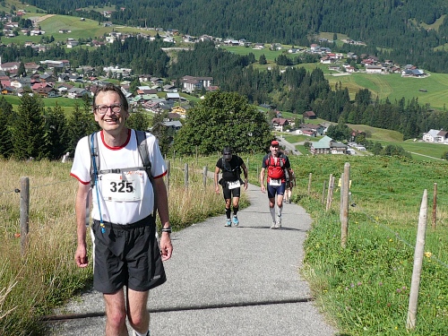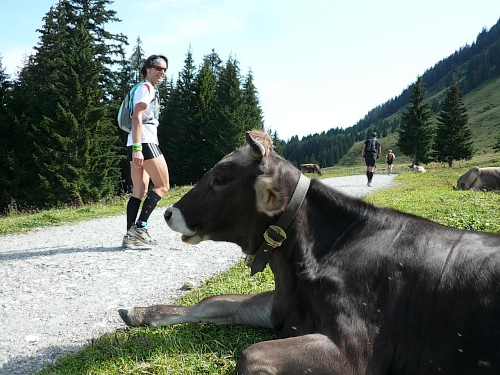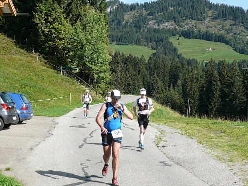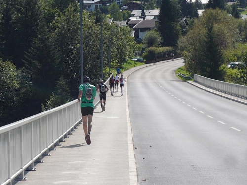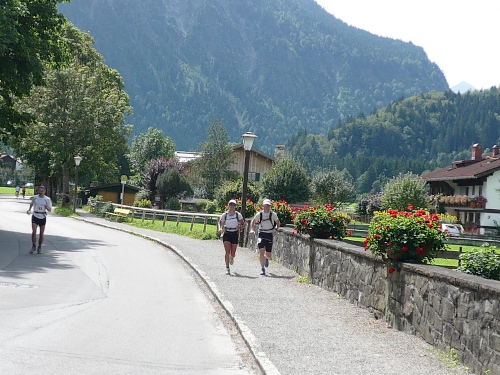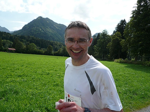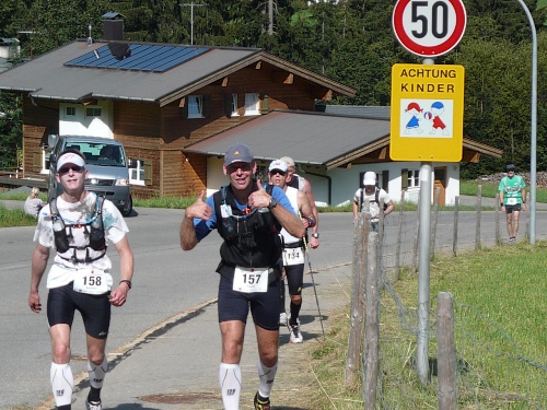 Der Asphalt endet (wieder einmal) und es gilt, einen rustikalen Trail unfallfrei zu belaufen. Beim Weiler Rohrmoos können wir wieder Wasser und Iso tanken. Der kurze Abstieg zuvor führte noch über grasige Almwege. Manfred Stärk aus Bad Waldsee und Bernies Lauffreund Mario Peschke sind ein längeres Stück meine Begleiter. Mario hat eine eigenartige Renngestaltung. „Am Anfang will ich in kurzer Zeit viel Weg schaffen“, so sein Credo. Dass dafür die hinteren Kilometer eher länger sind, ist fast die logische Konsequenz. Oder mag er sich länger quälen. Ich empfehle ihm beim nächsten Mal den Trainer „Quälix“ Magath.