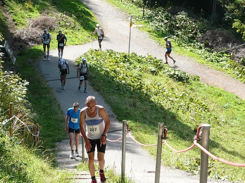 An der Hochleite geht gerade das Cola zur Neige. Ich schenke mit zwei Schluck ein und verdünne das ganze mit kühlem Wasser. Die Badegäste am Freibergsee sind schon weit zu hören. Bei dem etwa fünf Kilometer langen Abstieg Richtung See sollte man vorsichtig laufen, denn immer wieder warten Treppen und Naturstufen. Außerdem kann man sich die Oberschenkelmuskulatur ruinieren, wer hier schnell runter brettert.
