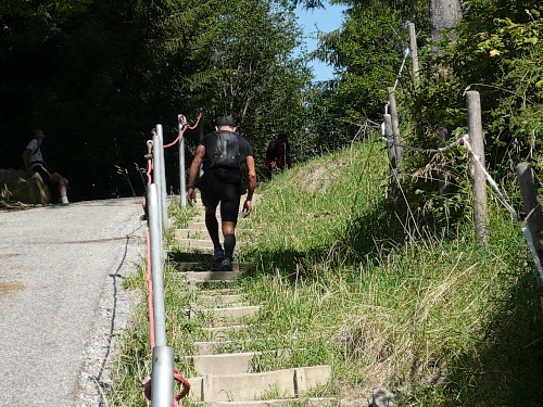 Mittels einer großen Betonbrücke überqueren wir das tiefe Tal der Breitach und gelangen so nach Westegg. Elend heiß ist es hier, gerade wenn wir in der Sonne laufen und die Kopfbedeckung saharatrocken ist. Die wenigen Brunnen werden von uns belagert. Am Kreisverkehr, wo wir wieder die Strasse überqueren, beginnt der zweite lange Anstieg hinauf zum Söllereck, anfangs auf einem Wanderweg noch mit ein paar rustikalen Treppen.
