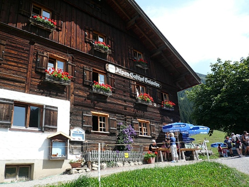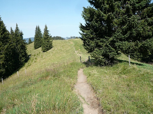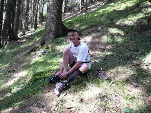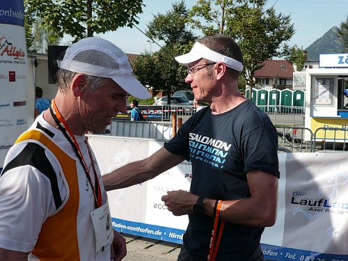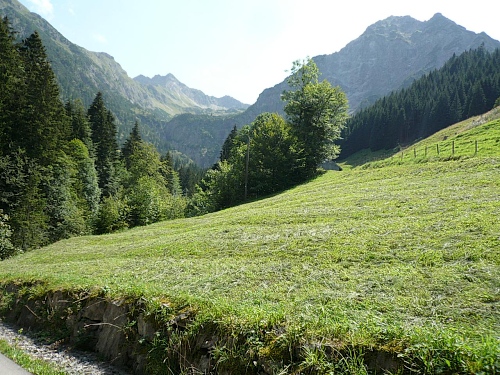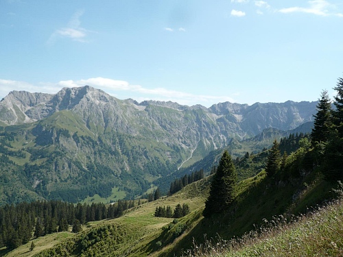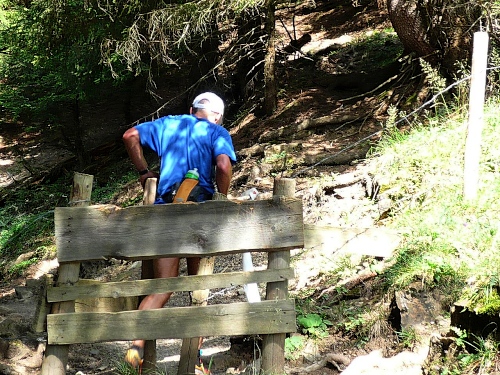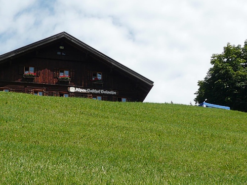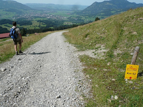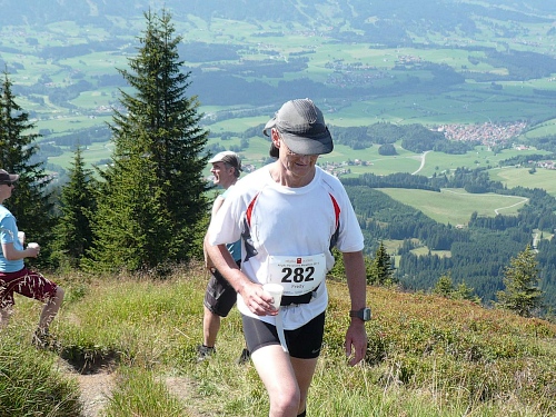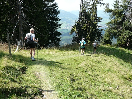 An der Gaisalpe (1149 Meter) gibt es Wasser und Iso. Die im Schatten sitzenden Wanderer sitzen gerade beim Nachmittagskaffee. Mitunter haben wir eine schöne Aussicht auf Fischen und die Hörnergruppe. Doch wo unsere Sicht ungetrübt ist, da stehen wir brettlbreit im Sonnenschein. Eine Zeitlang joggen Walter und ich Seite an Seite, dann zieht er mir davon. Ich kann dann an den Steigungen wieder aufschließen.