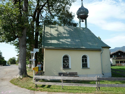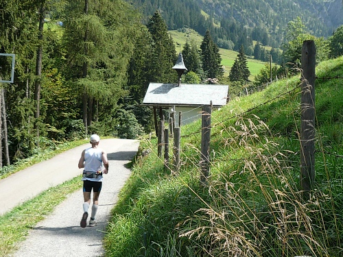 Nach zwei sausteilen Kehren zweigt der Kurs zum Gasthof Breitenberg ab. Wir gewinnen rasch Höhe. Und sind dann fast ein wenig enttäuscht, als uns ein Mountainbiker die zurückgelegte Höhendifferenz nennt. Noch keine 200 Höhenmeter liegen hinter Walter und mir. Nur mehr wenig Laufeinlagen sind jetzt möglich. Der eigentlich leicht zu laufende Wallrafweg bringt uns zur Gaisalpe, wo ich vorher einen Blick in die Gaisalpkapelle werfe und ein Stoßgebet losschicke.