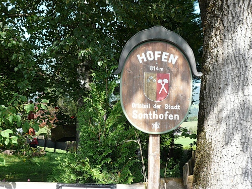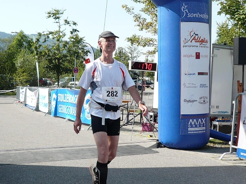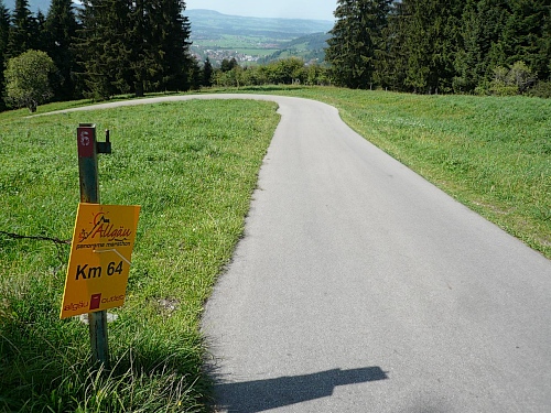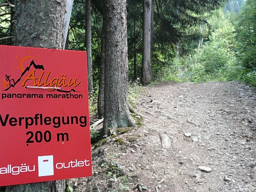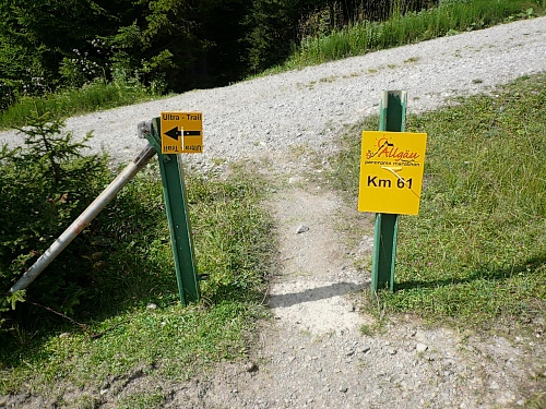 Nun ist fast jeder Kilometer ausgeschildert. Es geht nur noch bergab, fast alles kann ich laufen. Am Sonthofer Hof (1180 Meter) ist die letzte Trinkpause. Drei, vier Kilometer weiter sehe ich das Ortsschild Sonthofen. Ich bin im Ortsteil Hofen. Da werde ich dann neben einer Garage auf einem Trampelpfad geschickt. Ein paar Meter später erkenne ich, dass hinter dem Zaun die Ordensburg liegt. Aha, nur ein wenig um das Kasernengelände herum und dann noch kurz steil hinab ins Tal des Schwarzenbach.