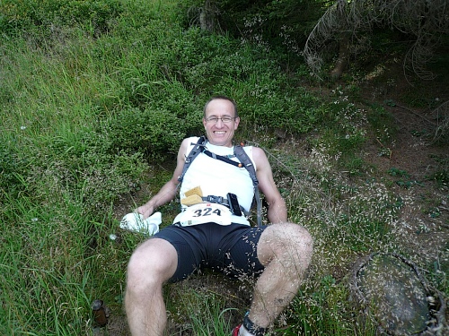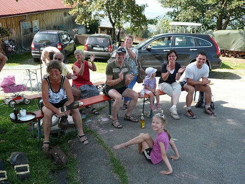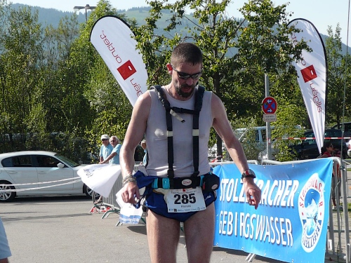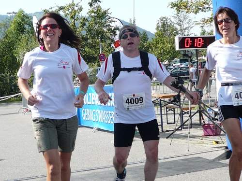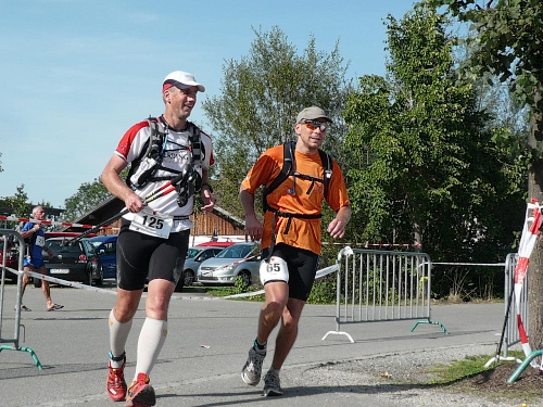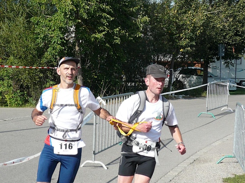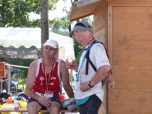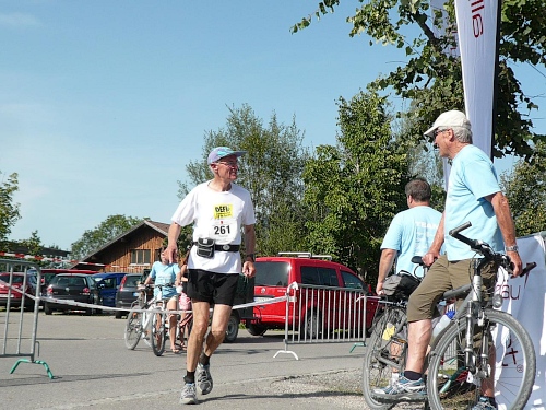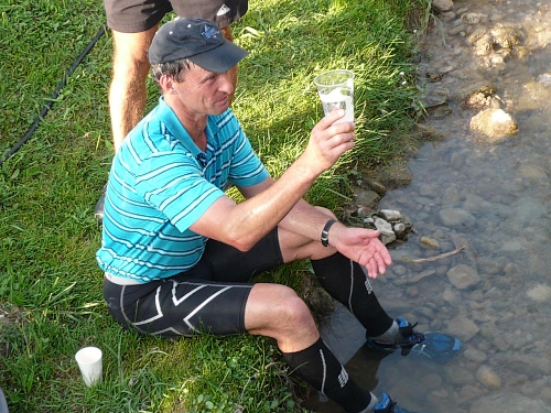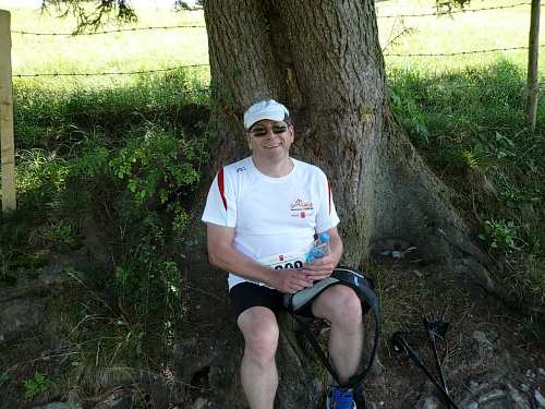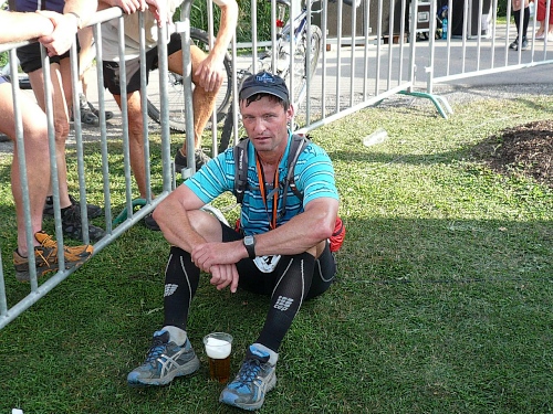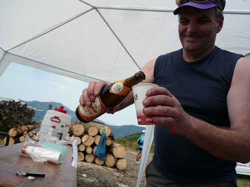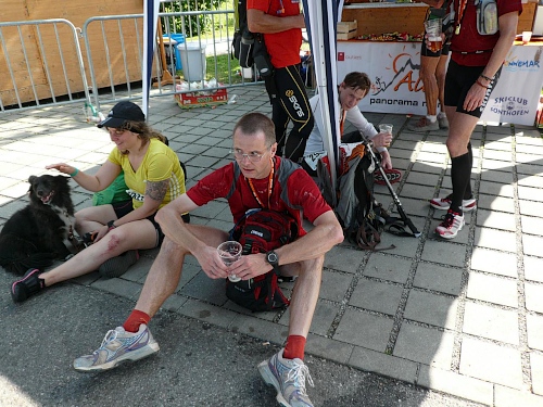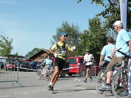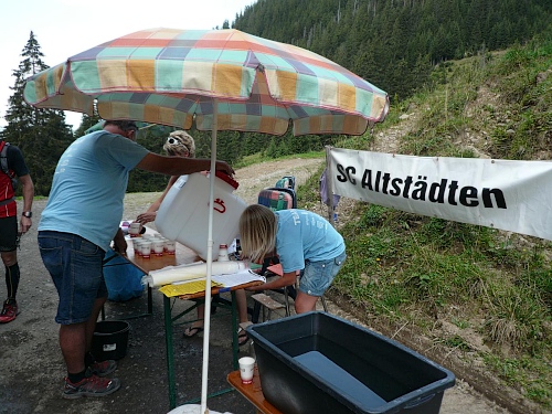Nur mehr knapp zehn Kilometer bergab. Nach etwa ein, zwei schwierigen Kilometern bergab, wo nochmals Konzentration gefordert ist, finden wir eine Vollversorgungsstelle. Eine schöne Aussicht hat man hier. Auf mein „Habt’s Ihr a bayerisches isotonisches Getränk“ bietet man mir ein „gscheits“ oder ein „kaschtrierts“ an. Die Belohnung ist gerechtfertigt, also schenkt der Helfer ein Helles ein. Beim Bierkonsum gibt es keinen Engpass, denn da bin ich erst der Zweite, der diesen Trank verlangt. Aber nächstes Jahr muss ich aufpassen, denn der Helfer wird dann auch einen Enzian in die Kühltasche einpacken. So verspricht er.