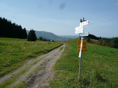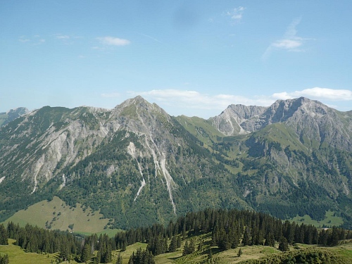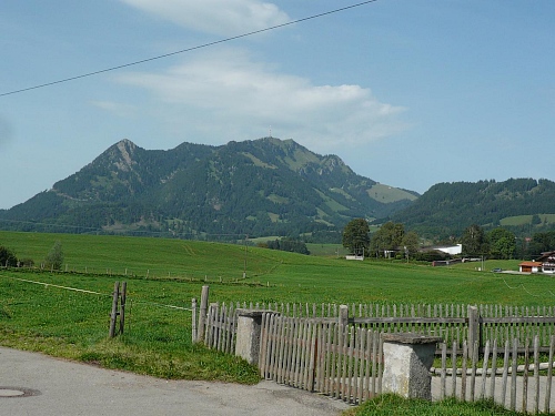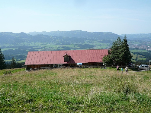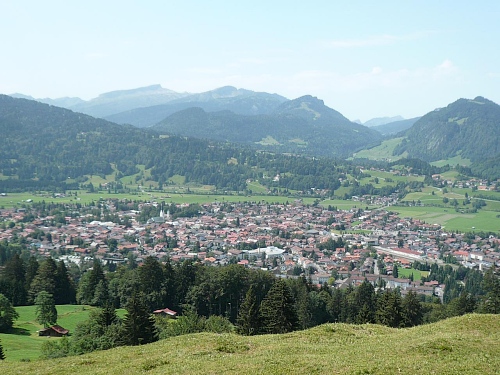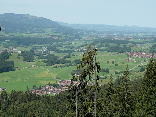 Die Schinderei hierher hat sich gelohnt, denn der wunderschöne Ausblick auf die umliegenden Gipfel ist Wahnsinn. Nach Norden sehen wir Sonthofen und auch die Ordensburg, wo unser Ziel am Wonnemar nur wenig entfernt liegt. Nach wenigen Minuten mache ich mich auf den Weiterweg.