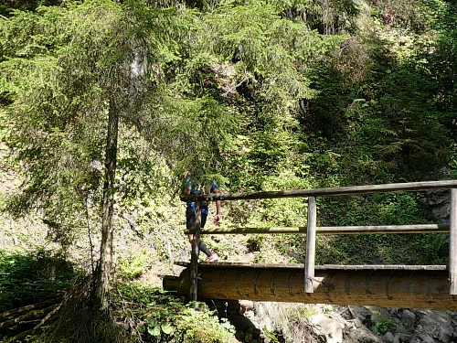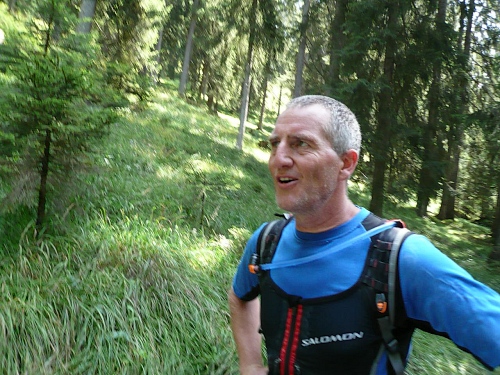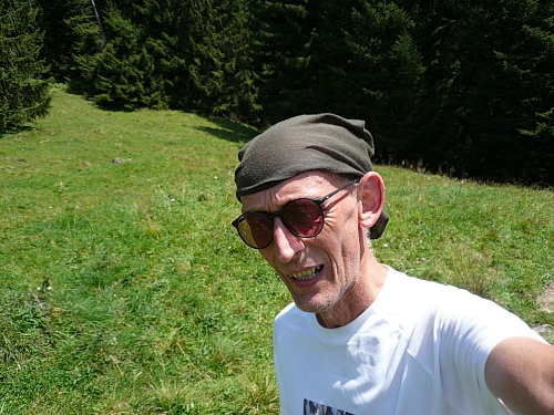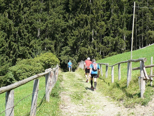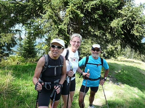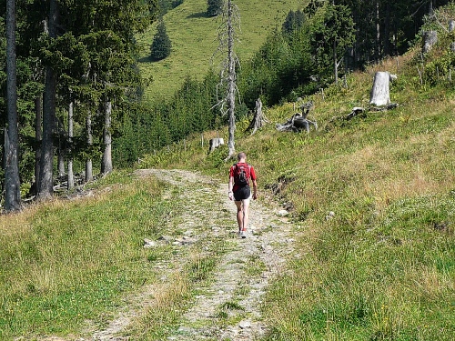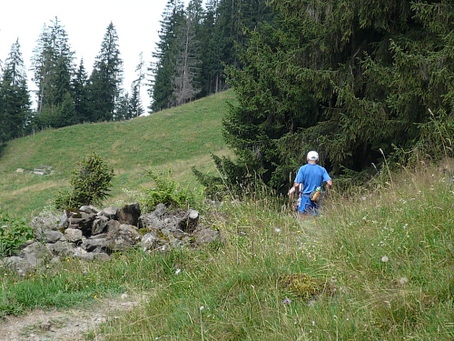 Der Wanderweg wird dann wieder ländlich und ruppig. Kein Laufen mehr möglich. Eher müssen in den Almwiesen schon einzelne Tritte gesucht werden. Walter schickt mich vor. Er muss kämpfen. Ich kann mich aber nicht entscheidend absetzen.