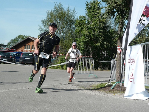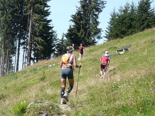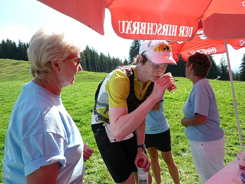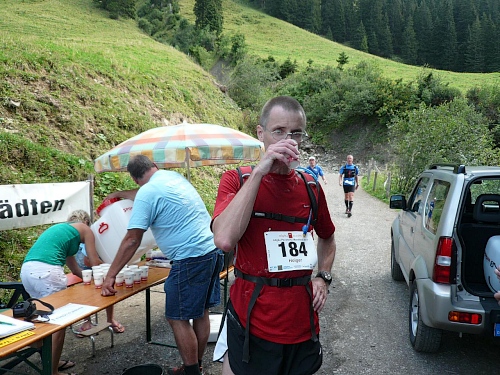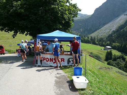 An der Entschenalp wurde kurzfristig eine Wasserstation eingerichtet. „Da vorn nach der Steinmauer zweigt der Kurs rechts ab. Ein Kilometer lang geht es hoch“, erklärt ein Helfer. Das ist der Knackpunkt. Der anspruchvollste Kilometer des Trails. Rund 250 bis 300 Höhenmeter. Laufen unmöglich, schnell marschieren ebenfalls. Kurze Tritte suchen, gleichmäßig gehen, nach Möglichkeit nicht nach hinten wegrutschen, das ist an diesem Stück zweckmäßig. Marschieren, schwitzen, schnaufen, saufen, ein leichtathletischer Vierkampf in diesen 20, 30 Minuten. Nicht lockerlassen. „Mir lend it lugg!“ sagt ein Allgäuer.