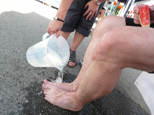Am Waldrand bei der Wassertretanlage sind einige Kneippanhänger bei ihrer Lieblingsbeschäftigung. Wie sagte Pfarrer Sebastian Kneipp: „Untätigkeit schwächt, Übung stärkt, Überlastung schadet.“ Das gilt auch heute. So genieße ich die letzten Meter, laufe an einem Haus durch die installierte Wasserbrause und dann nach wenigen Minuten ins Ziel am Wonnemar.