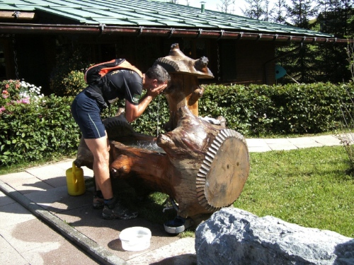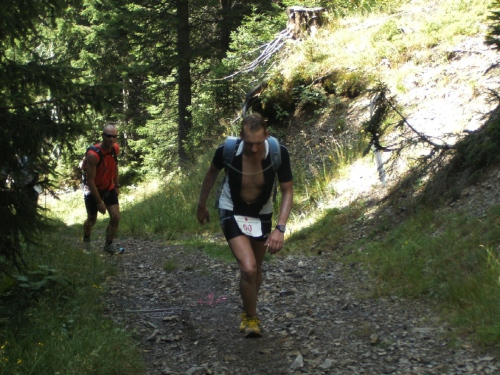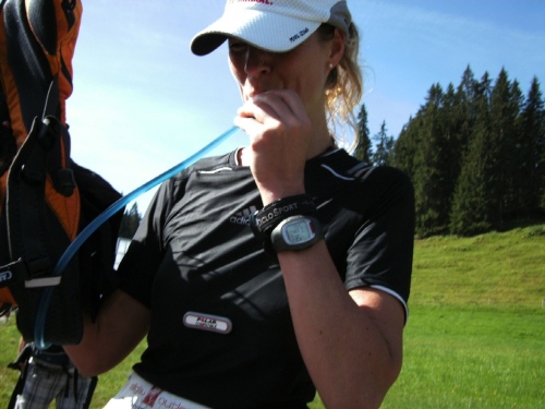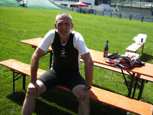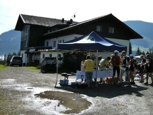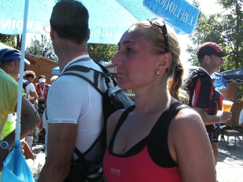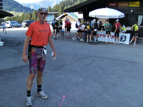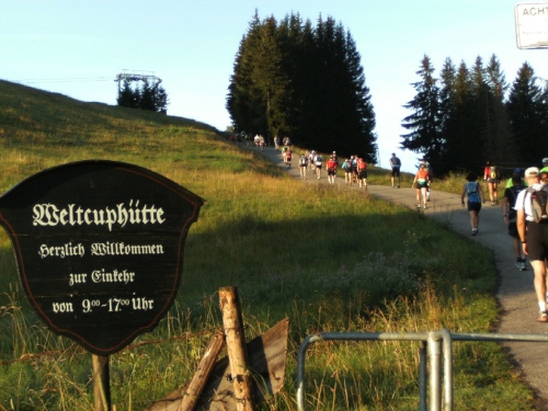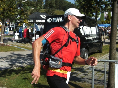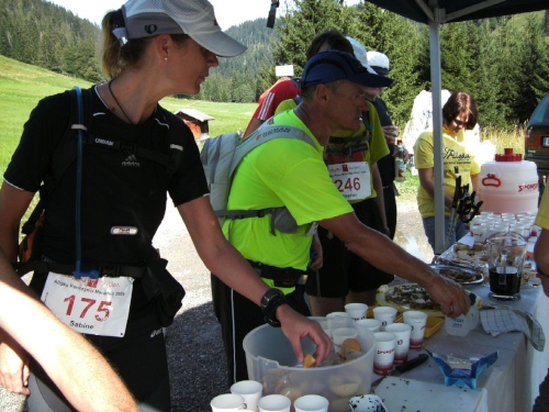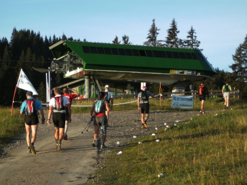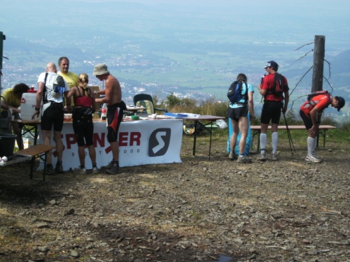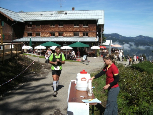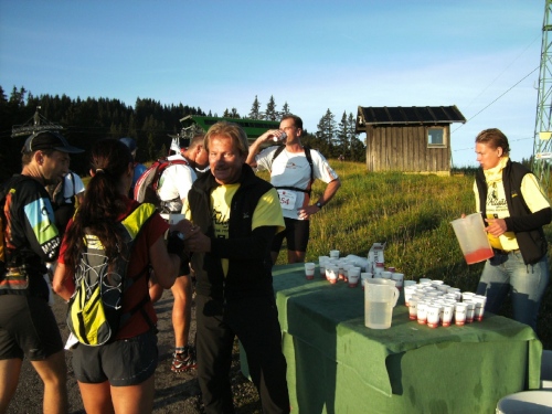 Für die Ultraläufer ist es so geregelt, dass in der Arena eine Versorgungsstation eingerichtet wurde. Auch können Läufer hier ihren Wettkampf nach 49 Kilometer regulär beenden. In der Arena sehe ich dann Karl Ziegelmeier auf der Bierbank sitzen. Für ihn ist Feierabend, denn am kommenden Wochenende wird er sich der Prüfung am Ultra Trail am Mont Blanc stellen. Ich verpflege wieder ausgiebig, auch mit Hopfenkaltschale und fülle meine Wasserflasche auf. Es folgt nämlich der härteste Anstieg. Rund zehn Kilometer mit knapp 1000 Höhenmetern auf den Sonnenkopf (1712 Meter).