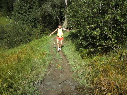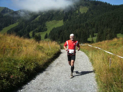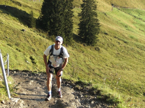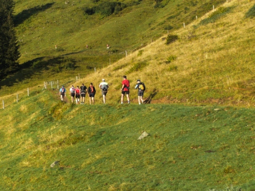 Dann kommt nach dem Entschenalp-Hof der Abzweig zum Sonnenkopf. Der folgende Kilometer ist der schwerste des ganzen Laufes. Ich vergleiche ihn mal mit dem Anstieg beim Glacier3000Run. Rund 250 bis 300 Höhenmeter. Laufen unmöglich, schnell marschieren ebenfalls. Kurze Tritte suchen, gleichmäßig gehen, nach Möglichkeit nicht nach hinten wegrutschen, das ist an diesem Stück zweckmäßig. Einige Läufer kann ich hier hinter mir lassen. Einer sitzt am Rand, fertig mit der Welt.