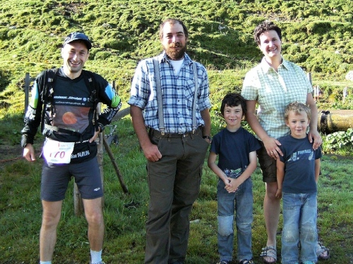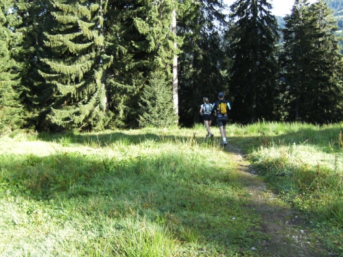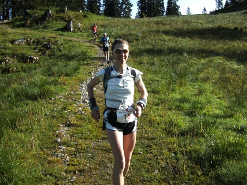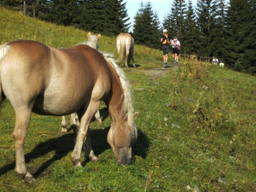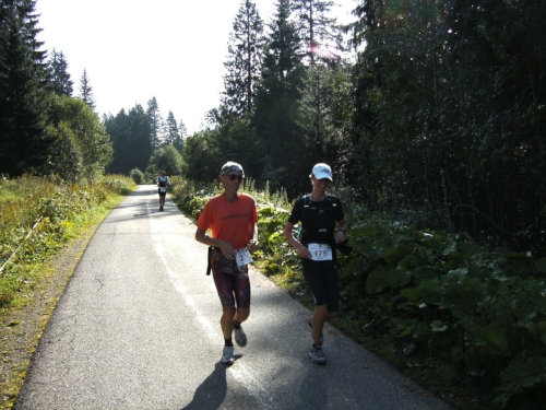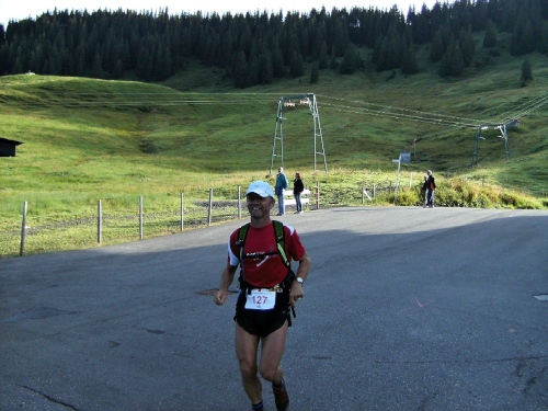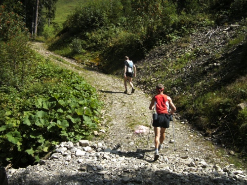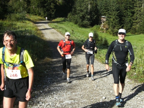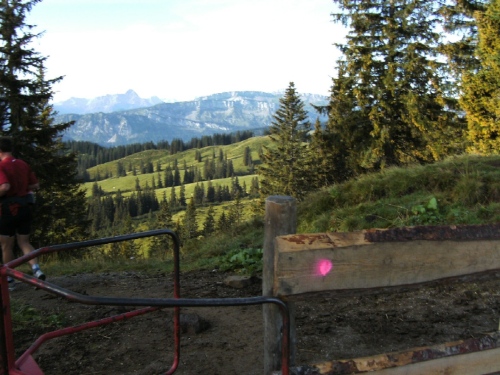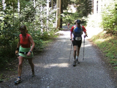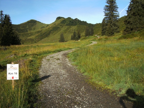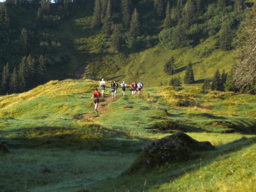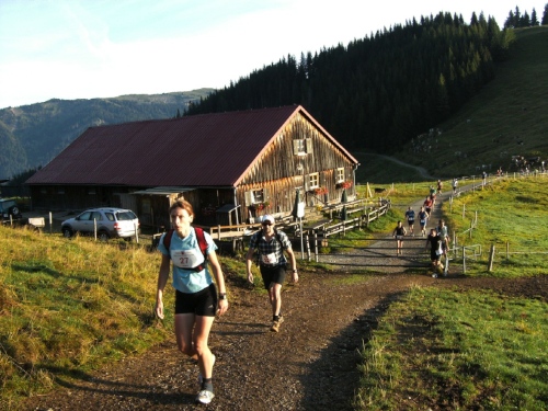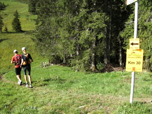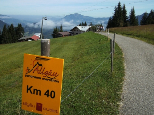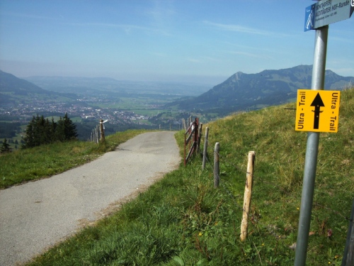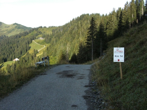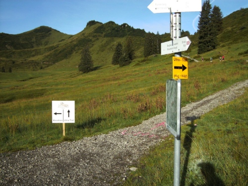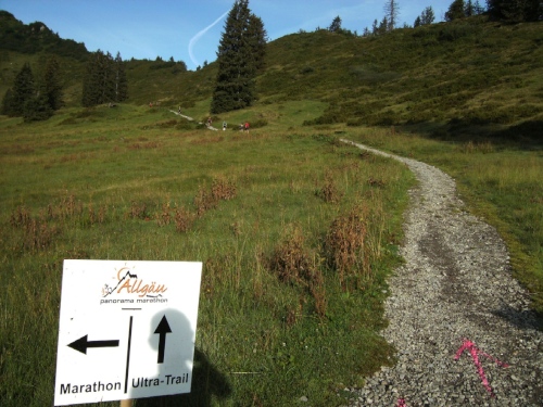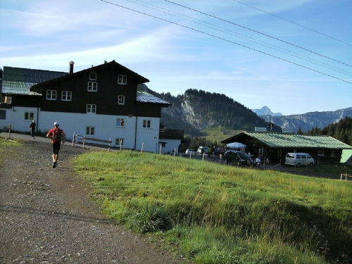 Es folgt ein kommoder Asphaltweg, Tendenz fallend an der Alpe Hinteregg vorbei zum Berghaus Schwaben. Dort wartet ein kurzer Gegenanstieg. Der folgende Trail zum Bolgenstall ist leicht wellig, aber einfach zu belaufen. Dort, etwa bei Kilometer 17, haben 2008 zwei Allgäuer Burschen mit Bier und Schnupftabak das ganze beobachtet. Heute liegen sie wohl noch in ihrer Kiste. Und just da ist die Trennung. Die Marathonis biegen später links ab, für uns geht es geradeaus ins Neuland.