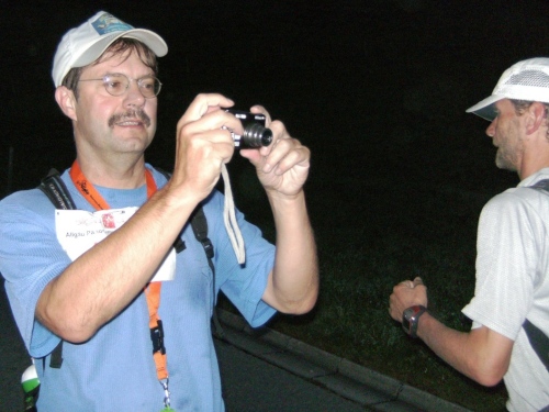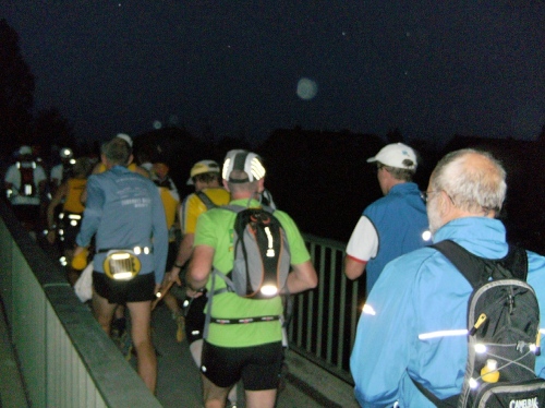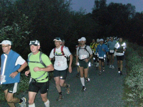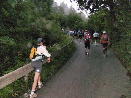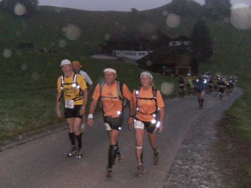 Es ist jetzt noch fast Nacht, das Morgengrauen hat schon eingesetzt, hoffentlich beginnt der Tag nicht mit einem Morgengrausen. Fürs Fotografieren fehlt noch deutlich das Licht. Für einige wenige Blitzaufnahmen wird’s schon reichen. Aufgrund meiner Trödelei bin ich am Ende der Läuferschlange, auch mal eine andere Erfahrung. Dafür heißt es jetzt „morgens um sechs, im Frühtau, ab in die Berge, marsch, marsch.“ Stimmt auf die Sekunde.
