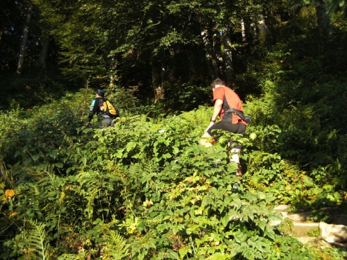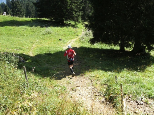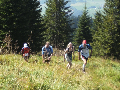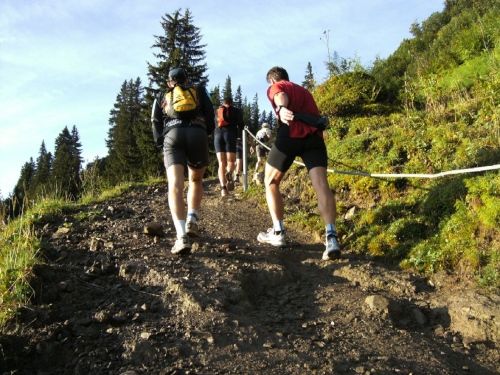 Es folgt nun ein Singletrail über den Gaisalptobel in Richtung Schöne Aussicht. Einige Konkurrenten sind jetzt wieder in Schlagdistanz. Es geht sehr steil zur Sache. Dann lässt die Steigung wieder nach. Ich bin froh, wieder laufen zu können.