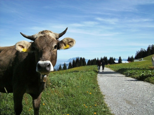 Die Wege sind nun gut zu belaufen, auch wenn mal ein kurzes Stück durch eine Almwiese führt. Ich sehe ein Schild des Ultra-Trail und dahinter eine Kuh. Wieder ein interessantes Motiv. Ich muss mich aber sputen für die Fotoarbeit, denn die Kuh kommt angewackelt. Nicht dass mir die über meine salzige Birne schleckt.