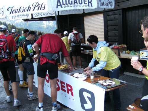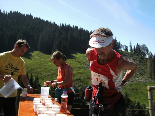 Hier ist die erste Hauptverpflegungsstelle. Butterbrote, Salz, Bananen, Riegel sind zu haben. Dann eine Allgäuer Spezialität, ein Zwetschgendatschi, wo ich gleich zwei, drei Stücke verzehre. Dann steht noch ein Weizenglas mit einem „Noagerl“ herum. Udo Stief verlangt dann Bier, worauf die Helferin nachschenkt. Und ich lasse mich mit dem Weizentrunk auch noch bedienen. Mit vollem Ranzen mache ich mich dann weiter. Mir kommt ein Bäuerchen aus.