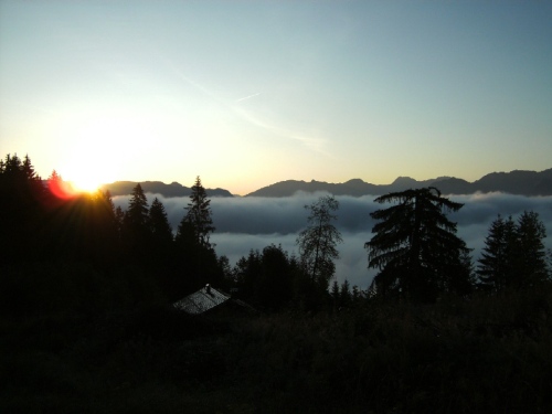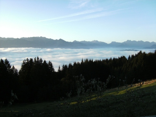 Immer weiter geht es aufwärts, manchmal auf Graswegen, die aufgrund des Nebels ein wenig glitschig sind. Dann folgt ein kurzer Stich in einem Waldstück, auch auf Wurzeln müssen wir aufpassen. Wir verlassen den Wald und sehen – blauen Himmel über uns und linkerhand den wallenden Nebel über dem Tal. Dahinter lugt der Grünten hervor, der Wächter des Allgäu. Und dann nach wenigen Augenblicken ein paar Meter weiter sehe ich die Sonne hinter den Bergen im Osten emporsteigen. Ein herrlicher Moment, ich möchte verweilen.