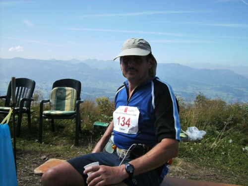 Nun ist das ärgste geschafft. Nur mehr knapp zehn Kilometer bergab. Nach etwa ein, zwei schwierigen Kilometern bergab finden wir noch eine Versorgungsstelle. Eine schöne Aussicht bietet sich uns. Nach Aufforderung wird mir ein einheimisches Hopfenprodukt angeboten. „Des is fei a richtigs Bier“, schwäbelt der Helfer. „Nur her damit“, sage ich. Der Peter Spengler lässt sich gleich auf einem Stuhl nieder. „Passt’s ma auf den auf. Nicht, dass der Peter bei euch versumpft“, so mache ich mich auf den weiteren Weg.