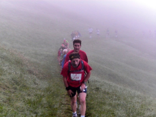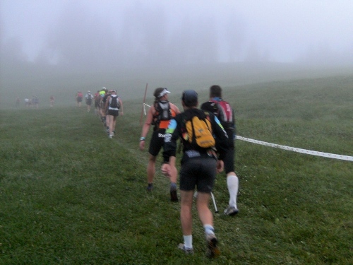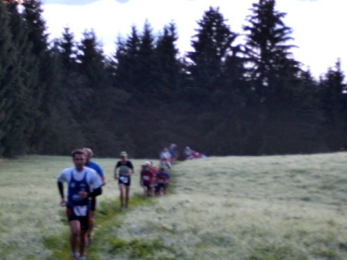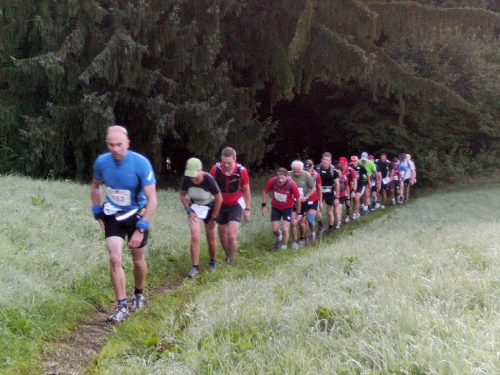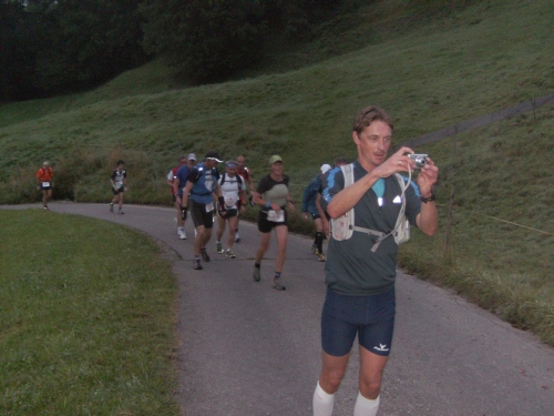 Nach etwa zwei Kilometer endet die Einrollphase, es geht ins Gelände nach links. An der Kurve bleibe ich stehen und habe dann gleich den Thomas Schmidtkonz vor meiner Linse. Die nächsten Kilometer sind noch alle belaufbar. Die Asphaltpiste endet dann, es folgt ein kurzer grasiger Feldweg. An einigen Punkten bleiben immer wieder Läufer stehen und fotografieren. Temperaturmäßig wird es so 12 Grad haben, kurzes T-Shirt und kurze Laufhose sind grad richtig. Warme Sachen braucht man nicht mitnehmen, denn in große Höhen dringen wir nicht vor. Und wer will, kann sich an eine Stelle Wechselklamotten hinbringen lassen.